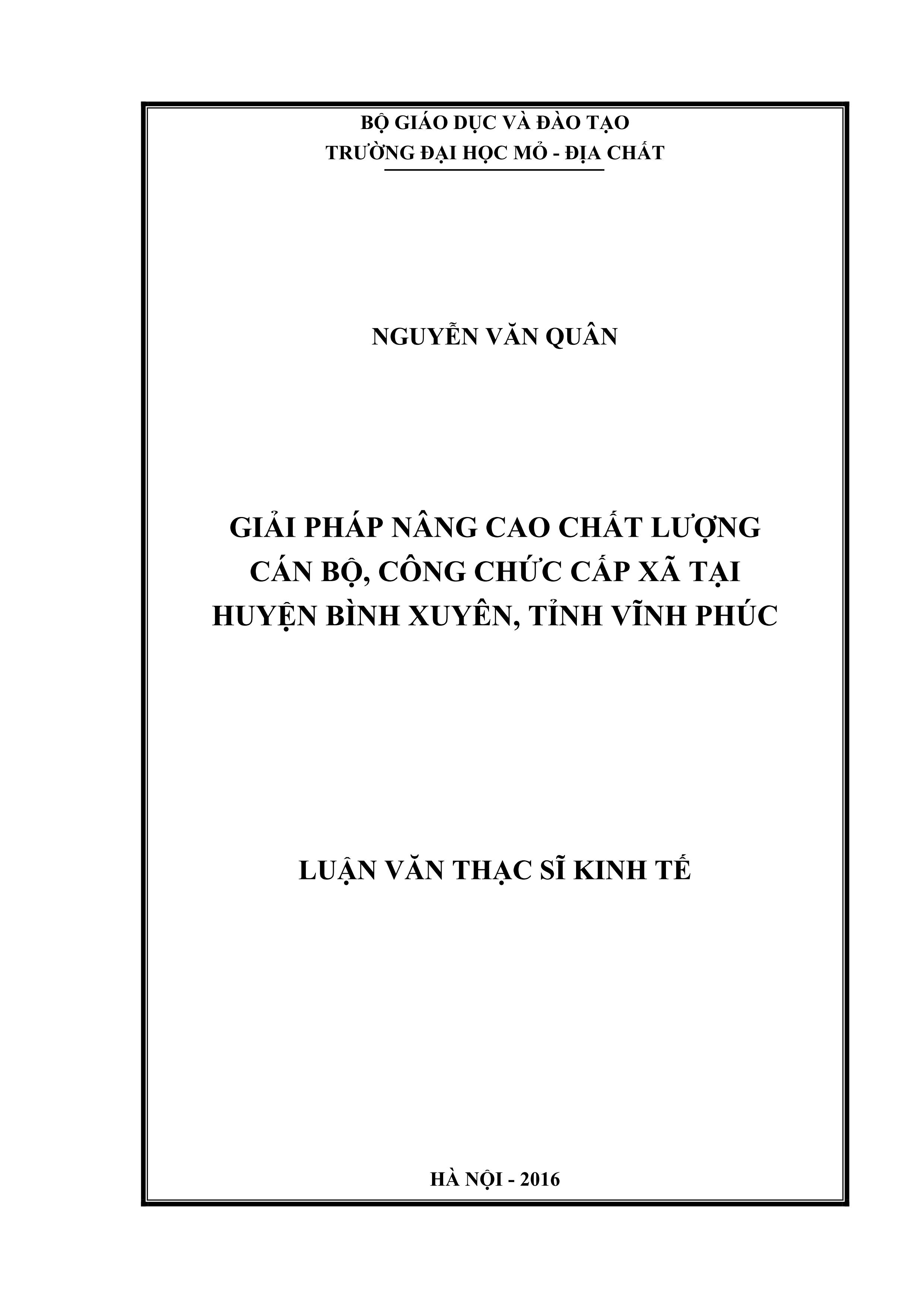 Giải pháp nâng cao chất lượng cán bộ, công chức cấp xã tại huyện Bình Xuyên, tỉnh Vĩnh Phúc : Luận văn thạc sĩ / Nguyễn Văn Quân