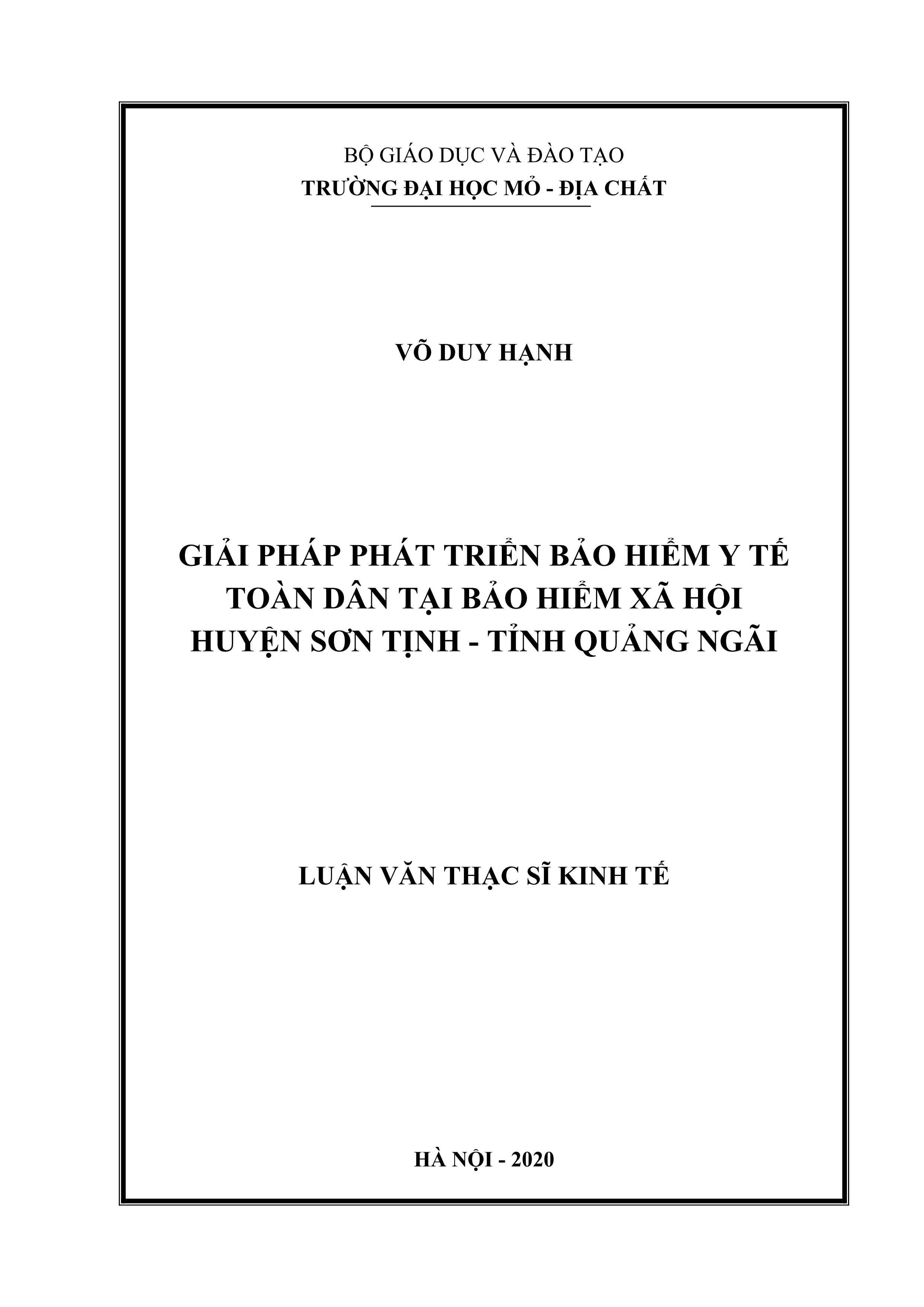 Giải pháp phát triển Bảo hiểm y tế toàn dân tại Bảo hiểm xã hội huyện Sơn Tịnh - tỉnh Quảng Ngãi : Luận văn thạc sĩ Kinh tế / Võ Duy Hạnh