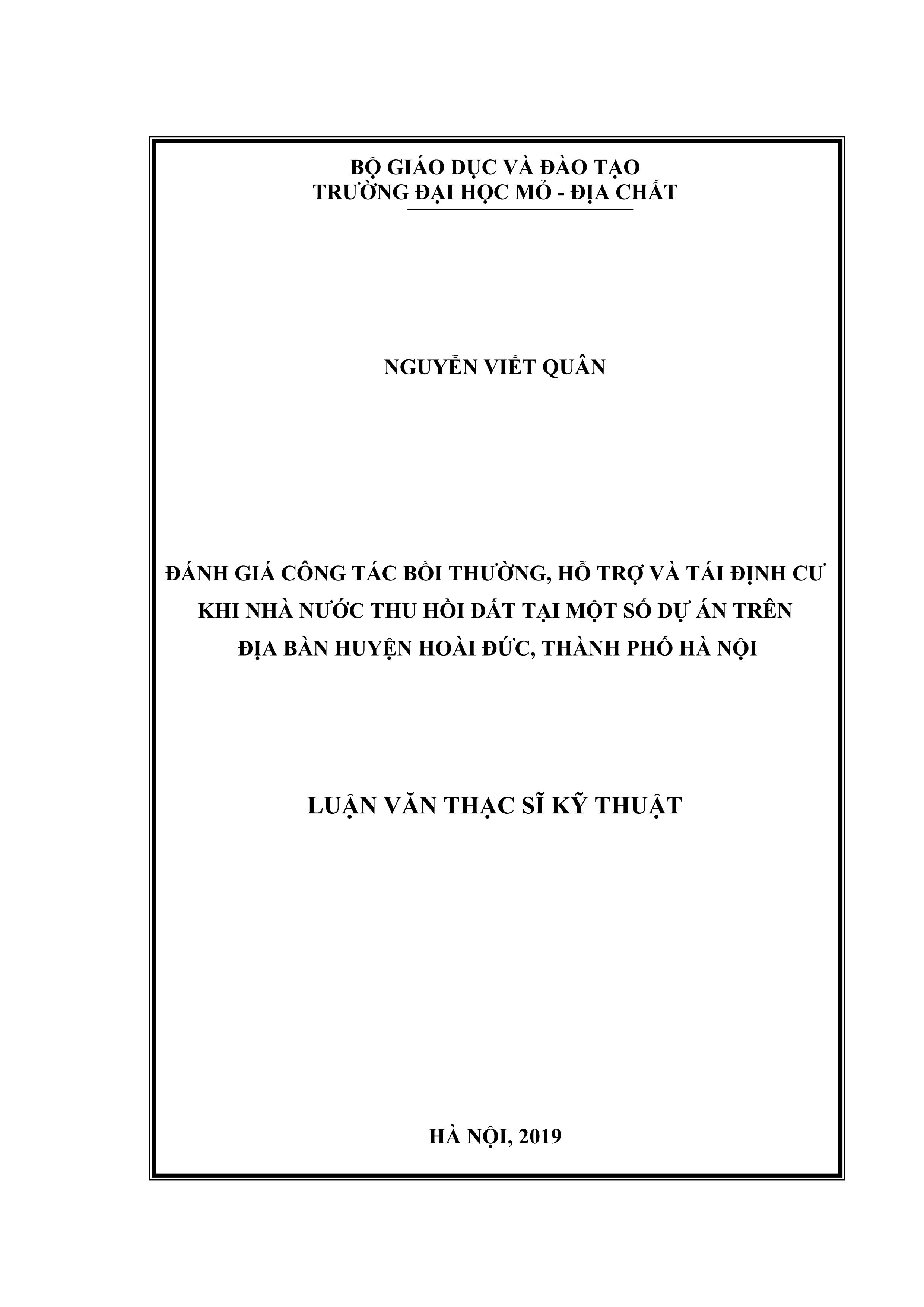 Đánh giá công tác bồi thường, hỗ trợ và tái định cư khi Nhà nước thu hồi đất tại một số dự án trên địa bàn huyện Hoài Đức, thành phố Hà Nội : Luận văn thạc sĩ kỹ thuật / Nguyễn Viết Quân