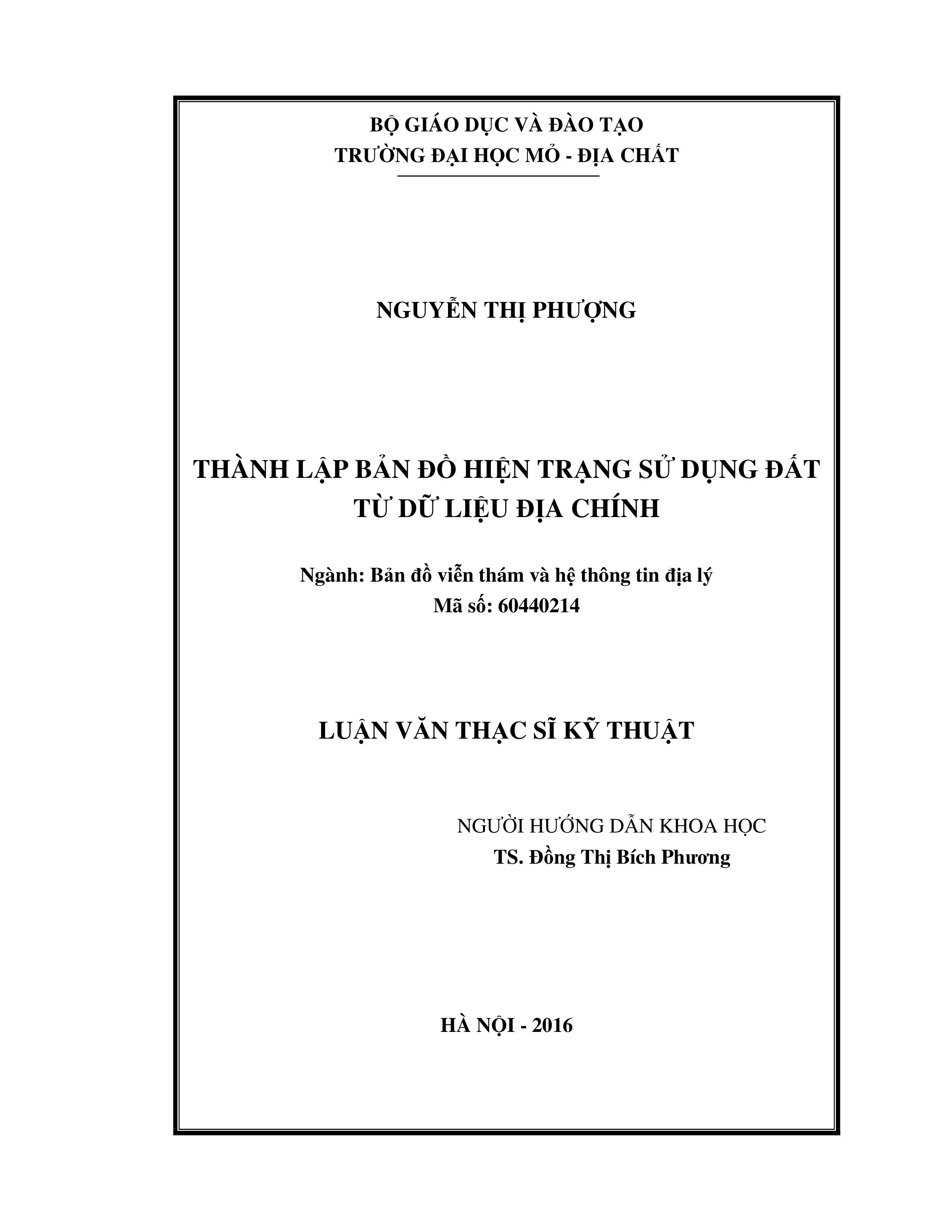 Thành lập bản đồ hiện trạng sủ dụng đất từ dữ liệu địa chính : Luận văn thạc sĩ / Nguyễn Thị Phượng