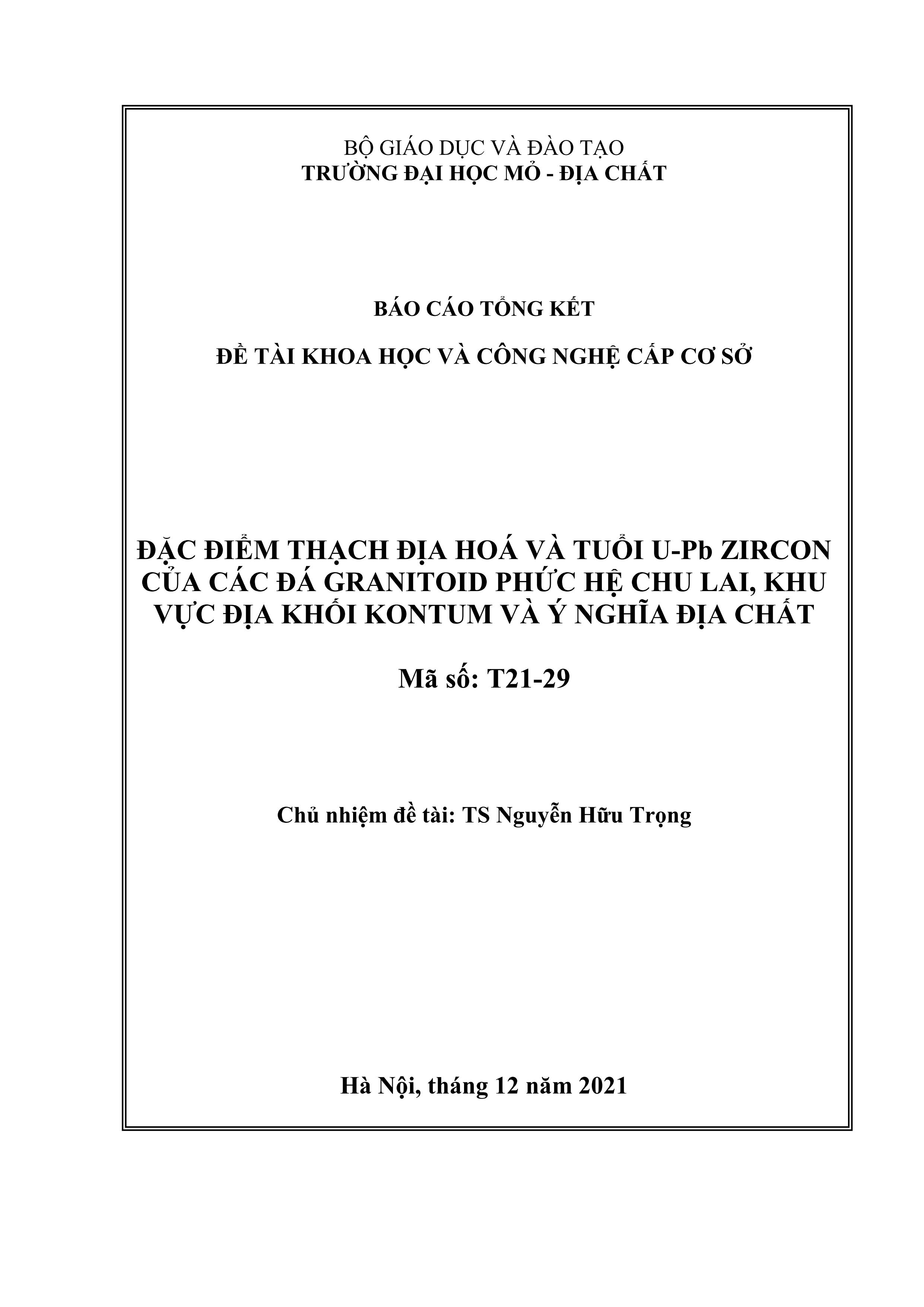Đặc điểm thạch địa hóa và tuổi U-Pb zircon của các đá granitoid phức hệ Chu Lai, khu vực địa khối Kontum và ý nghĩa địa chất : Đề tài khoa học và công nghệ cấp cơ sở / Nguyễn Hữu Trọng