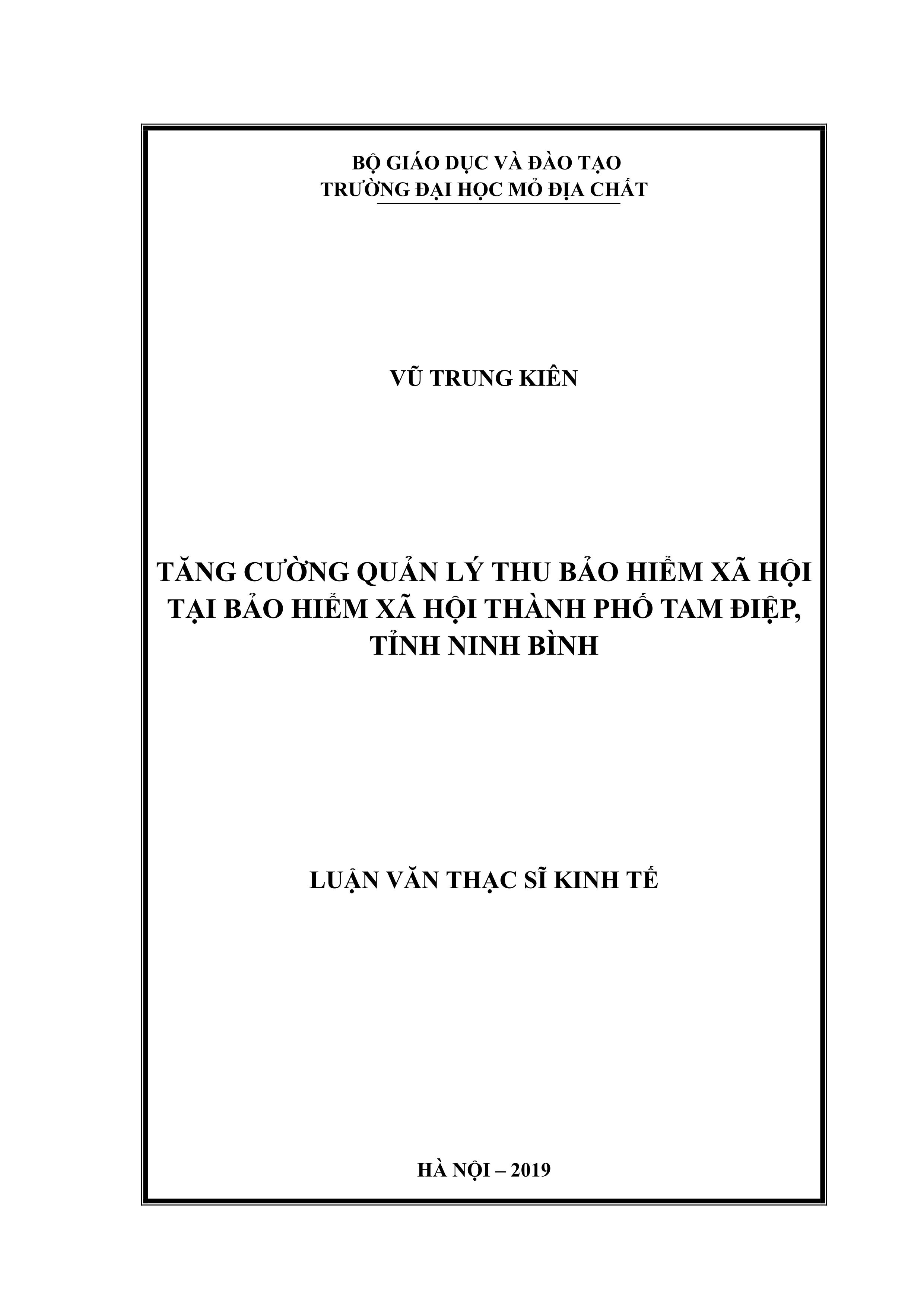 Tăng cường quản lý thu bảo hiểm xã hội tại bảo hiểm xã hội Thành phố Tam Điệp, tỉnh Ninh Bình : Luận văn thạc sĩ Kinh tế / Vũ Trung Kiên