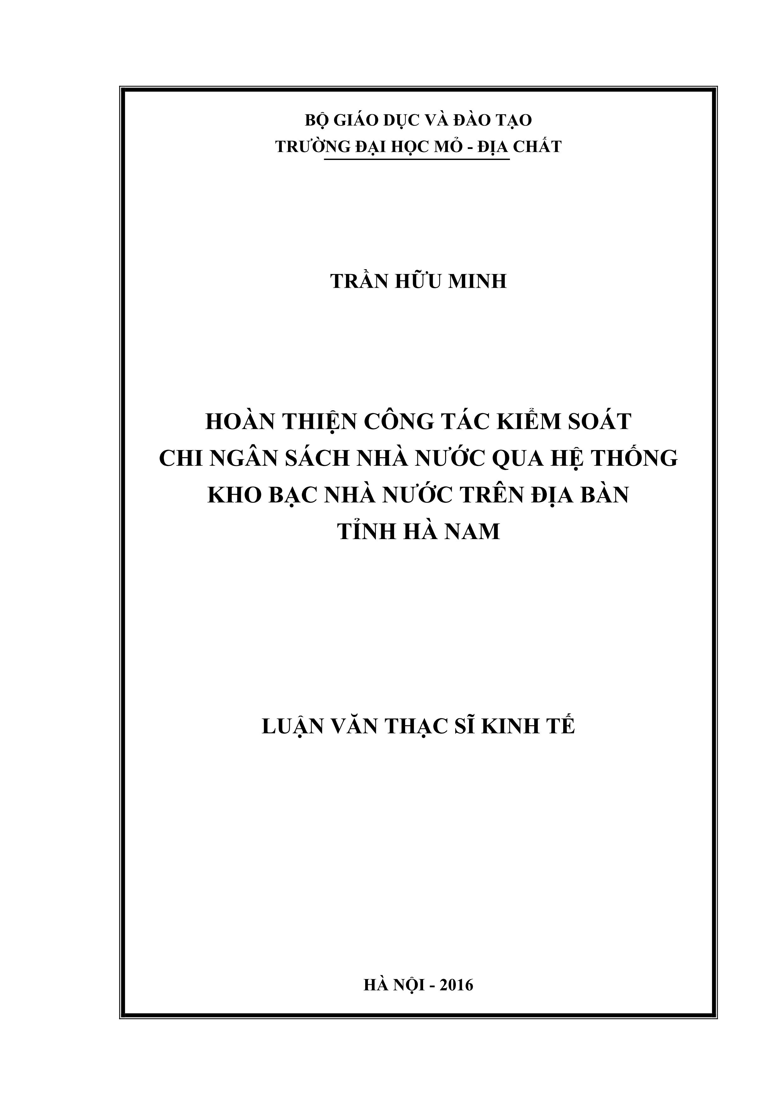 Hoàn thiện công tác kiểm soát chi ngân sách nhà nước qua hệ thống kho bạc nhà nước trên địa bàn tỉnh Hà Nam : Luận văn thạc sĩ / Trần Hữu Minh
