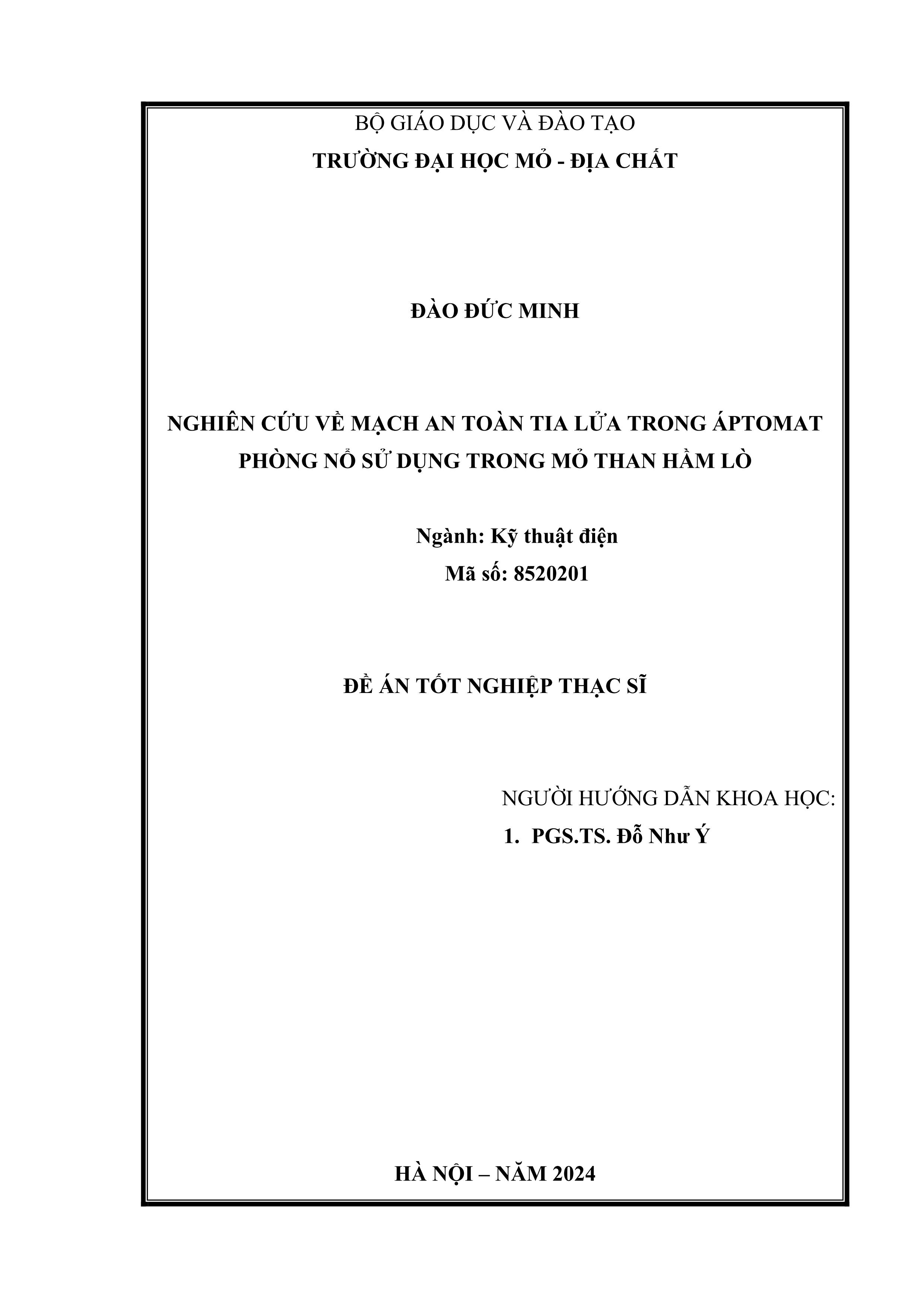 Nghiên cứu về mạch an toàn tia lửa trong aptomat và phòng nổ sử dụng trong mỏ than hầm lò : Đề án thạc sĩ kỹ thuật / Đào Đức Minh