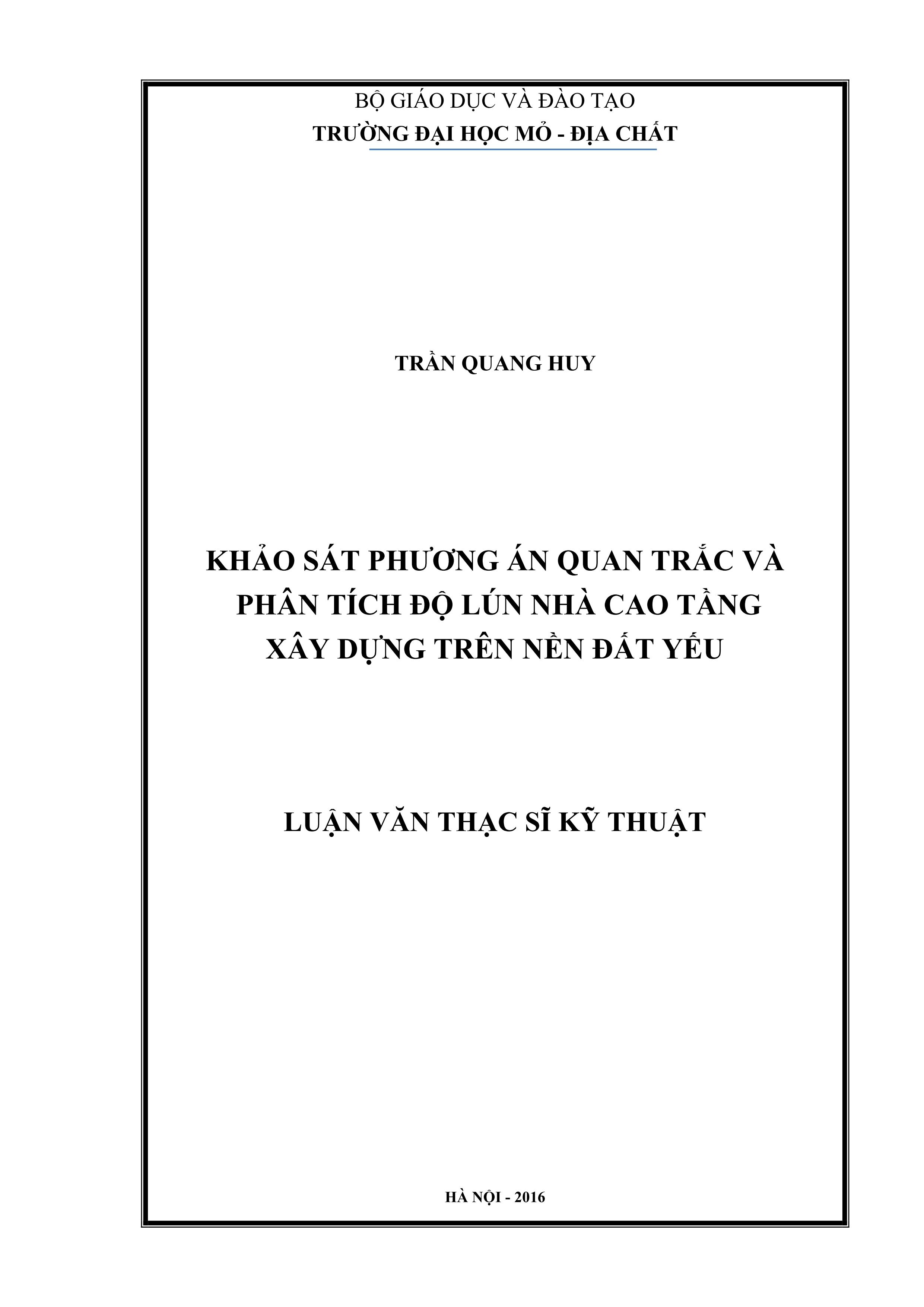 Khảo sát phương án quan trắc và phân tích độ lún nhà cao tầng xây dựng trên nền đất yếu : Luận văn thạc sĩ / Trần Quang Huy