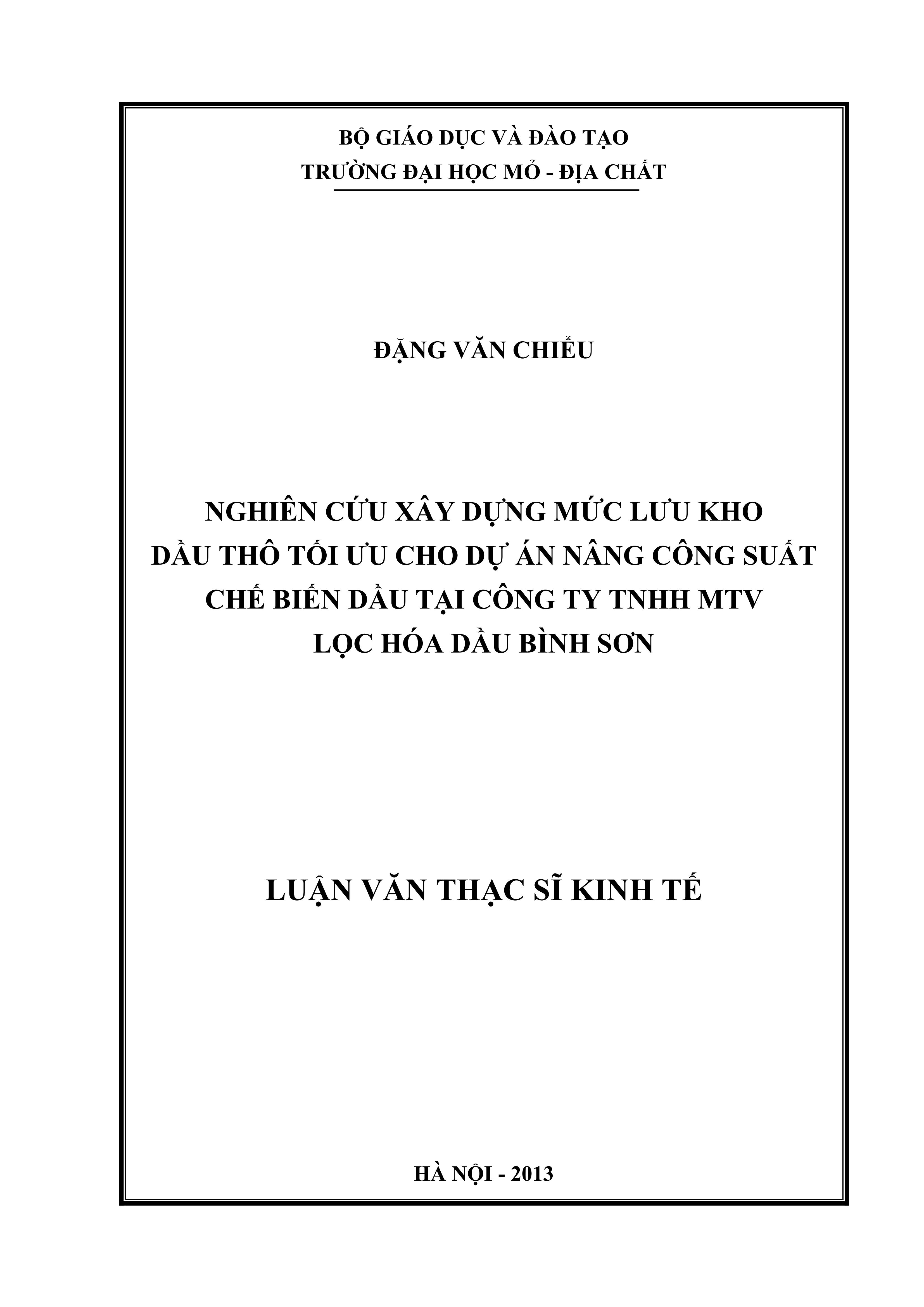 Nghiên cứu xây dựng mức lưu kho dầu thô tối ưu cho dự án nâng công suất chế biến dầu tại công ty TNHH MTV lọc hoá dầu Bình Sơn : Luận văn thạc sĩ / Đặng Văn Chiểu