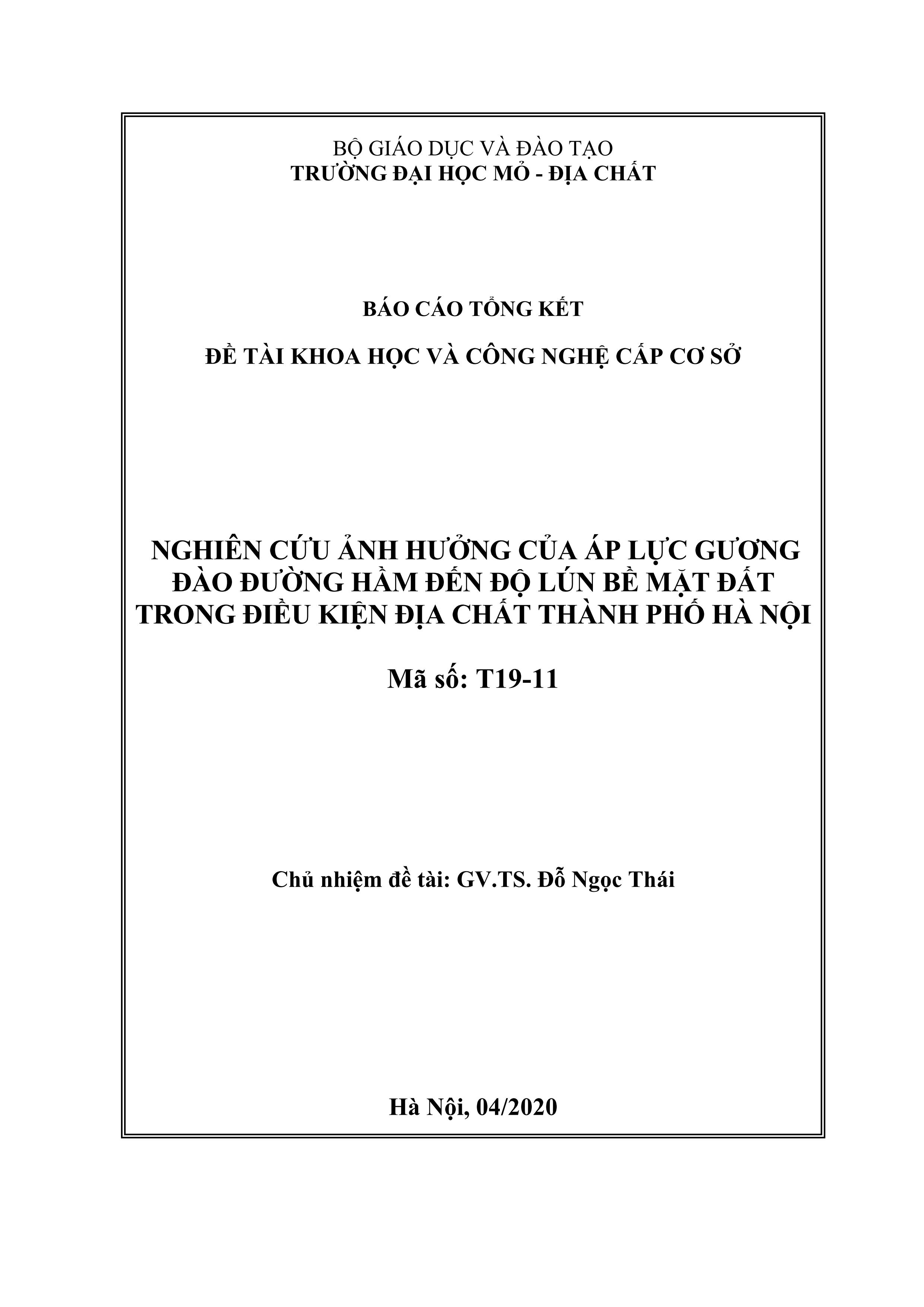 Nghiên cứu ảnh hưởng của áp lực gương đào đường hầm đến độ lún bề mặt đất trong điều kiện địa chất thành phố Hà Nội : Đề tài khoa học và công nghệ cấp cơ sở / Đỗ Ngọc Thái