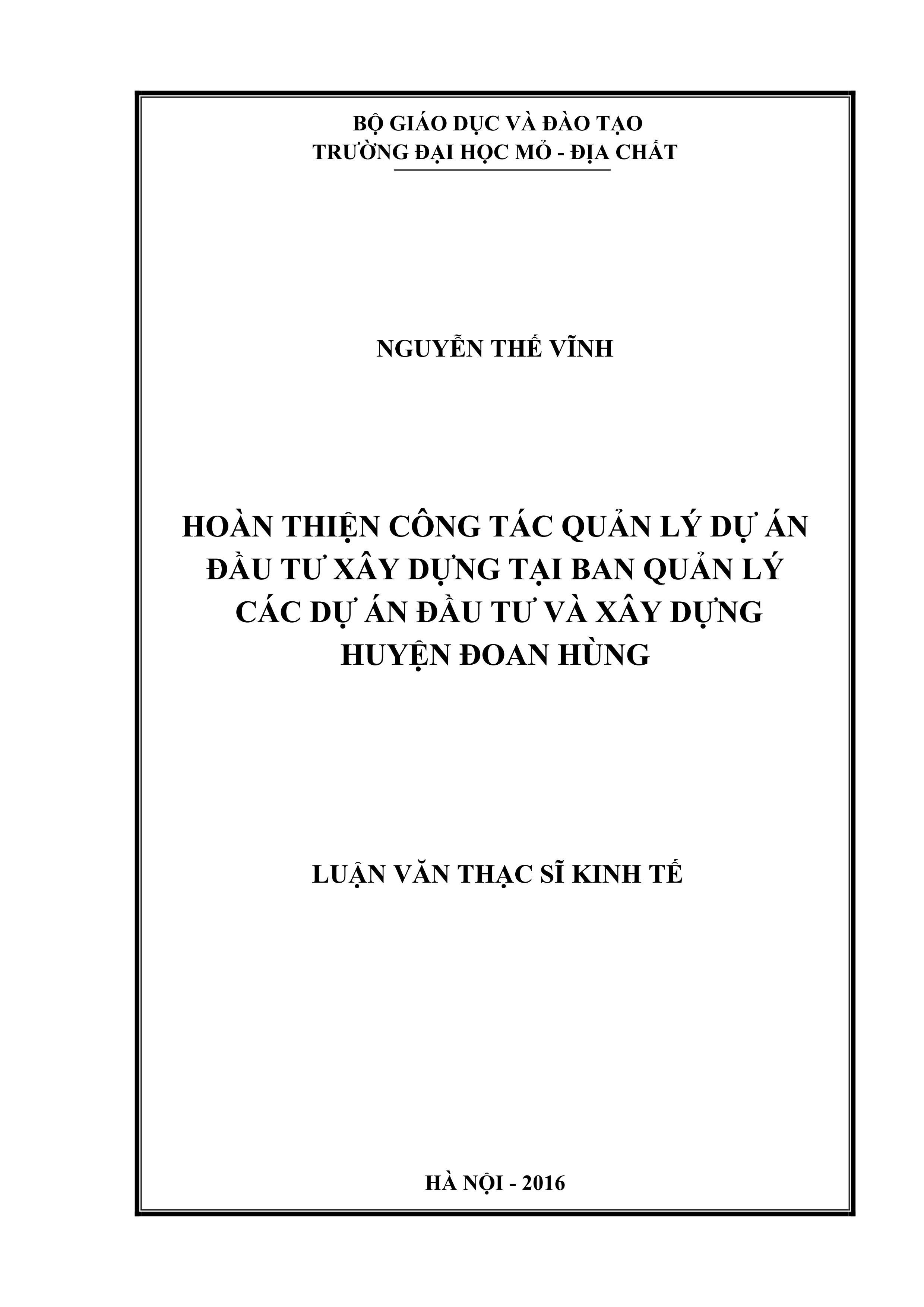 Hoàn thiện công tác quản lý dự án đầu tư xây dựng tại Ban quản lý các dự án đầu tư và xây dựng huyện Đoan Hùng : Luận văn thạc sĩ / Nguyễn Thế Vĩnh