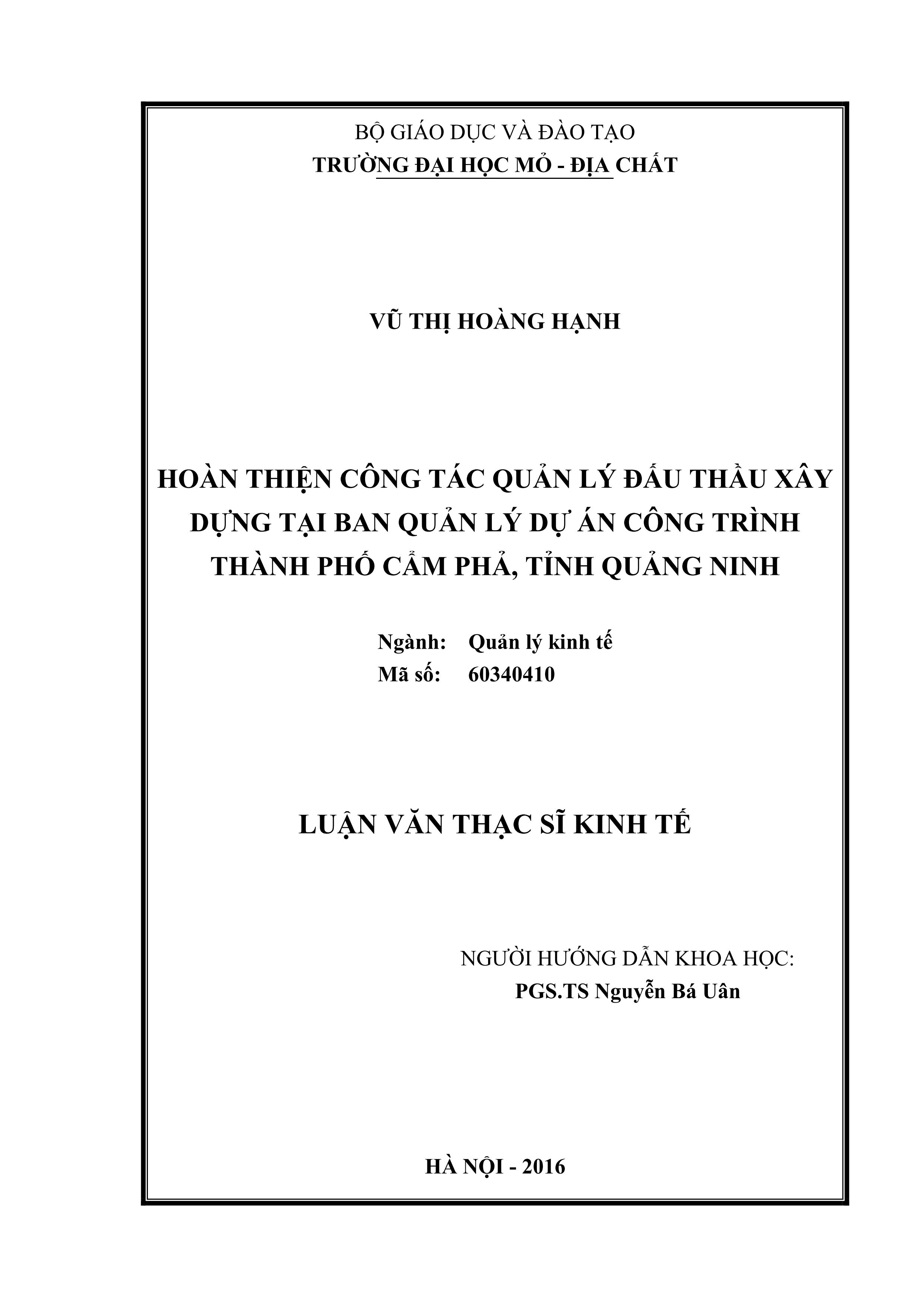 Hoàn thiện công tác quản lý đấu thầu xây dựng tại Ban quản lý dự án công trình thành phố Cẩm Phả, tỉnh Quảng Ninh : Luận văn thạc sĩ / Vũ Thị Hoàng Hạnh