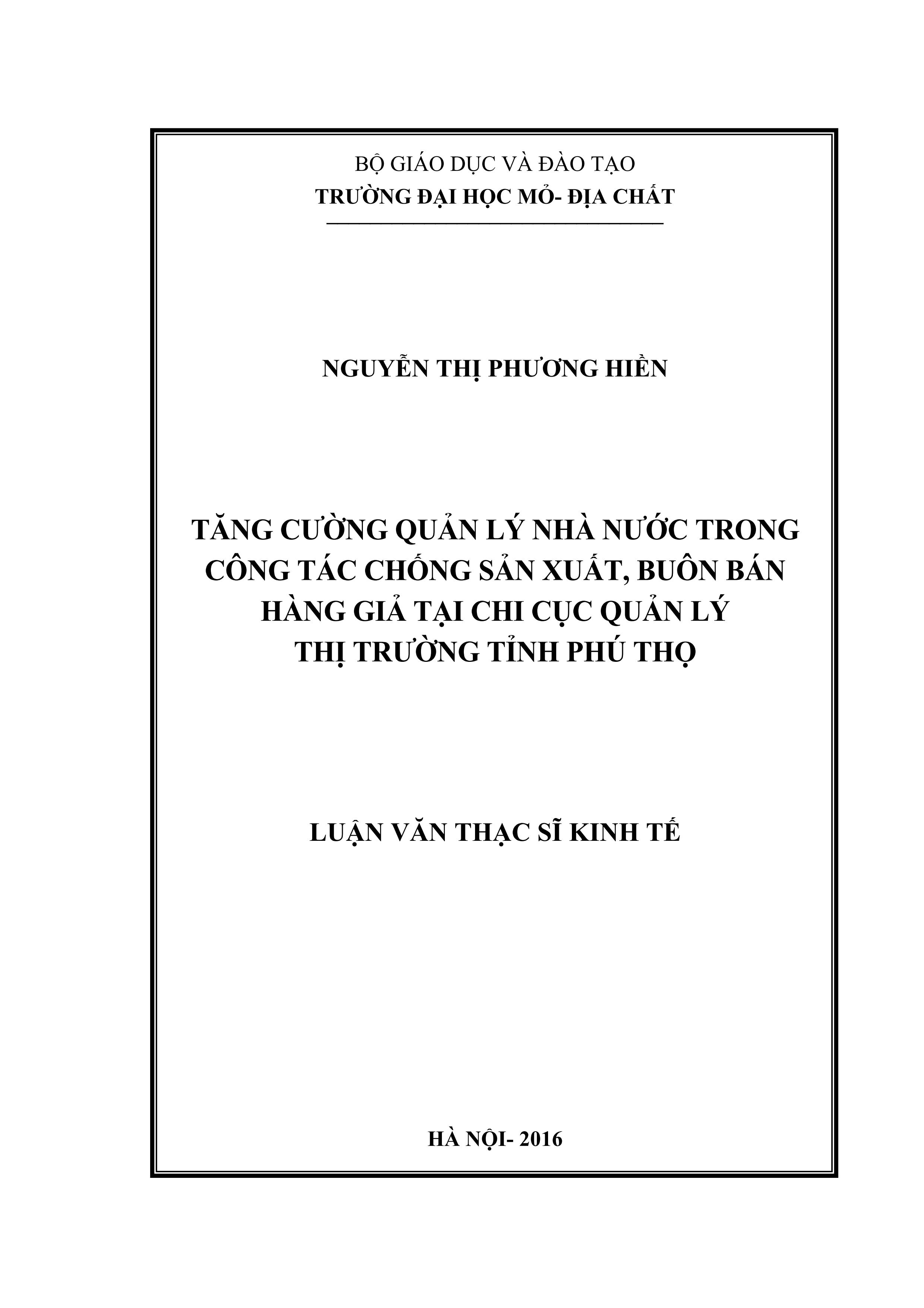 Tăng cường quản lý nhà nước trong công tác chống sản xuất, buôn bán hàng giả tại Chi cục quản lý thị trường tỉnh Phú Thọ : Luận văn thạc sĩ / Nguyễn Thị Phương Hiền