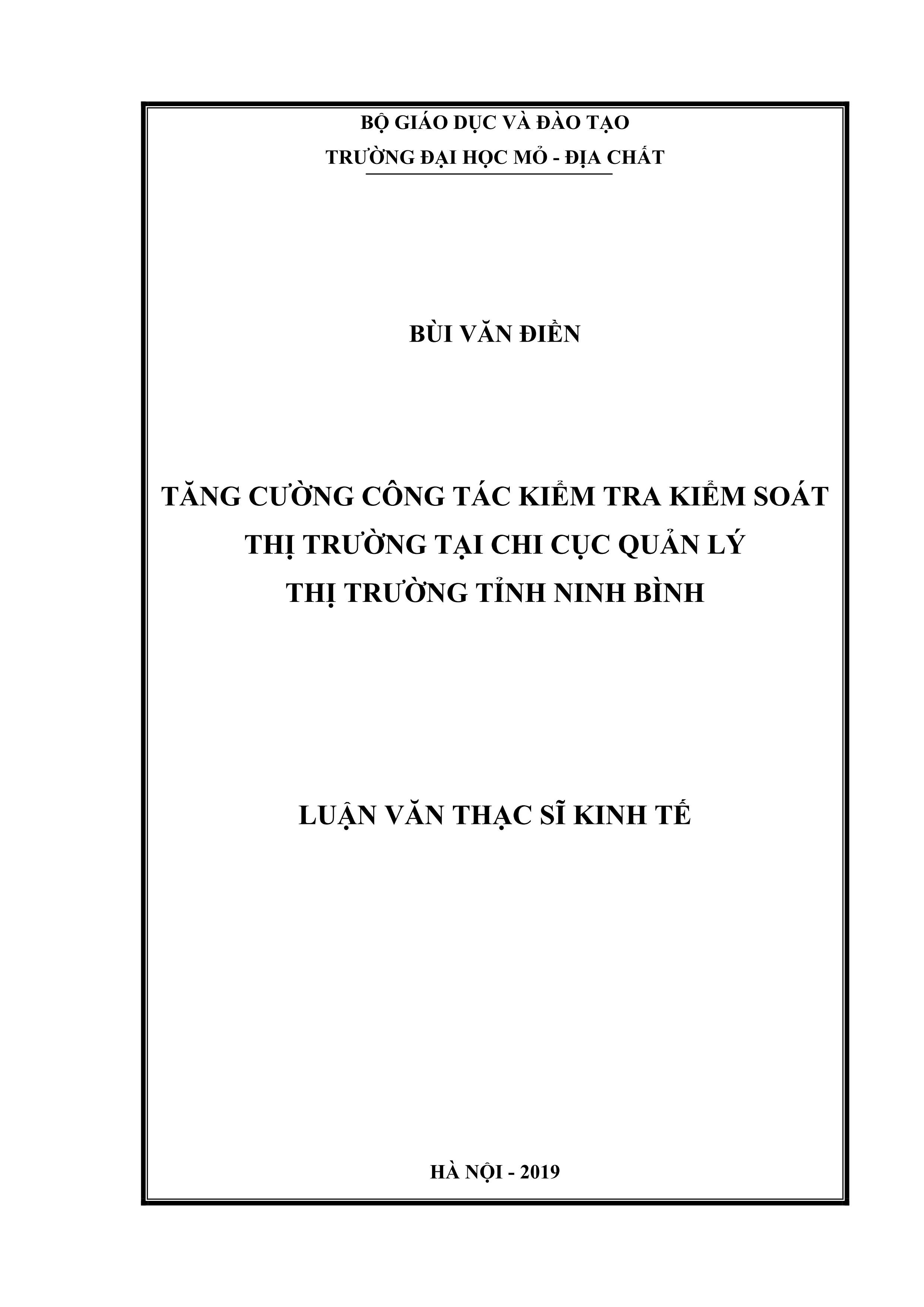 Tăng cường công tác kiểm tra kiểm soát thị trường tại Chi cục quản lý thị trường tỉnh Ninh Bình : Luận văn thạc sĩ Kinh tế / Bùi Văn Điền