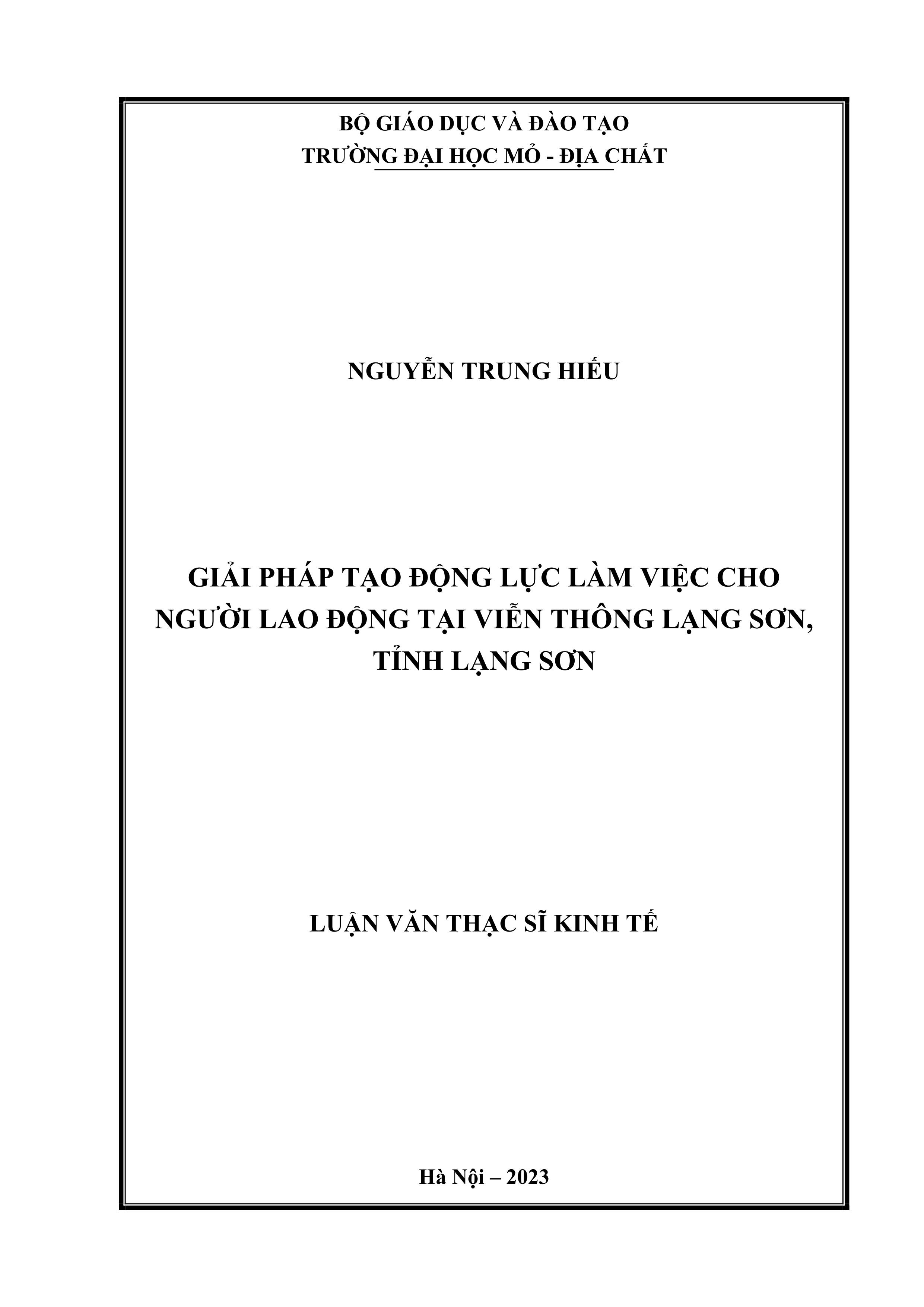 Giải pháp tạo động lực làm việc cho người lao động tại viễn thông Lạng Sơn, tỉnh Lạng Sơn : Luận văn thạc sĩ Kinh tế / Nguyễn Trung Hiếu