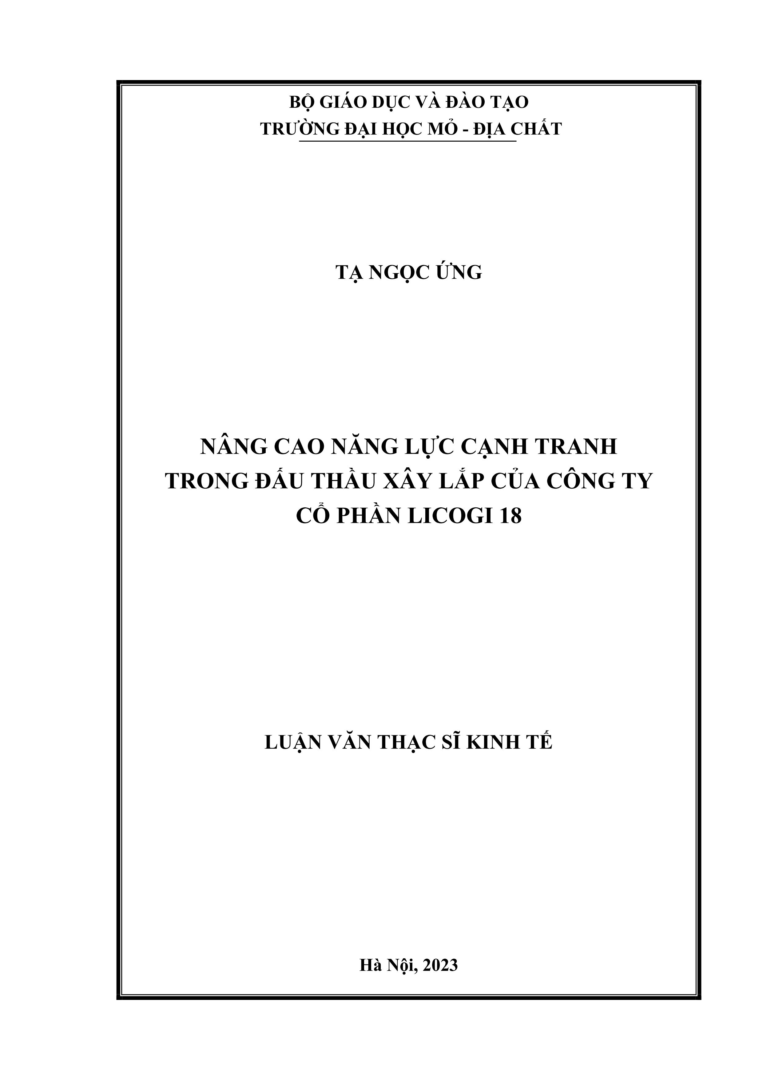 Nâng cao năng lực cạnh tranh trong đấu thầu xây lắp của công ty cổ phần Licogi 18 : Luận văn thạc sĩ Kinh tế / Tạ Ngọc Ứng