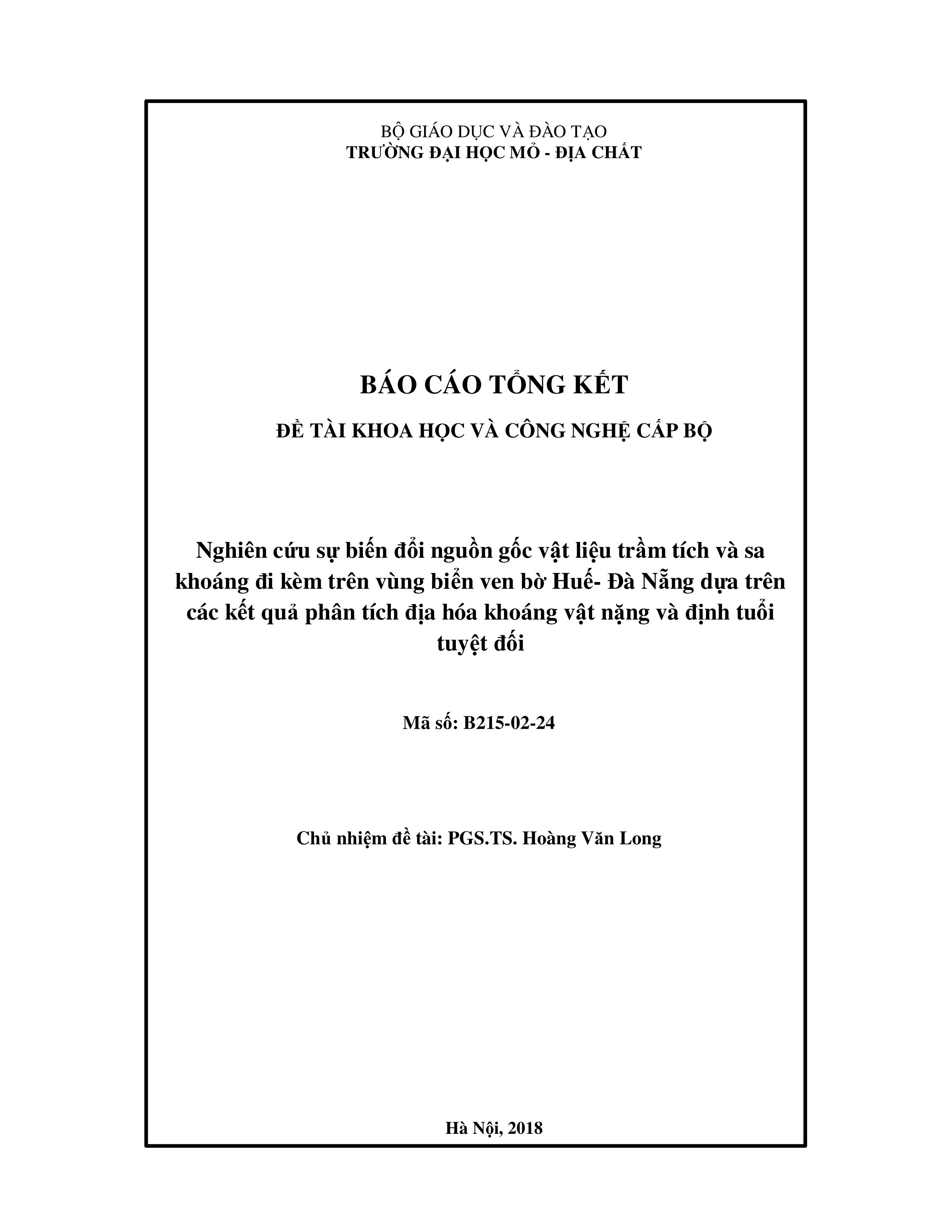 Nghiên cứu sự biến đổi nguồn gốc vật liệu trầm tích và sa khoáng đi kèm trên vùng ven bờ Huế - Đà Nẵng dựa trên các kết quả phân tích địa hóa khoáng vật nặng và định tuổi tuyệt đối : Đề tài khoa học và công nghệ cấp bộ / Hoàng Văn Long