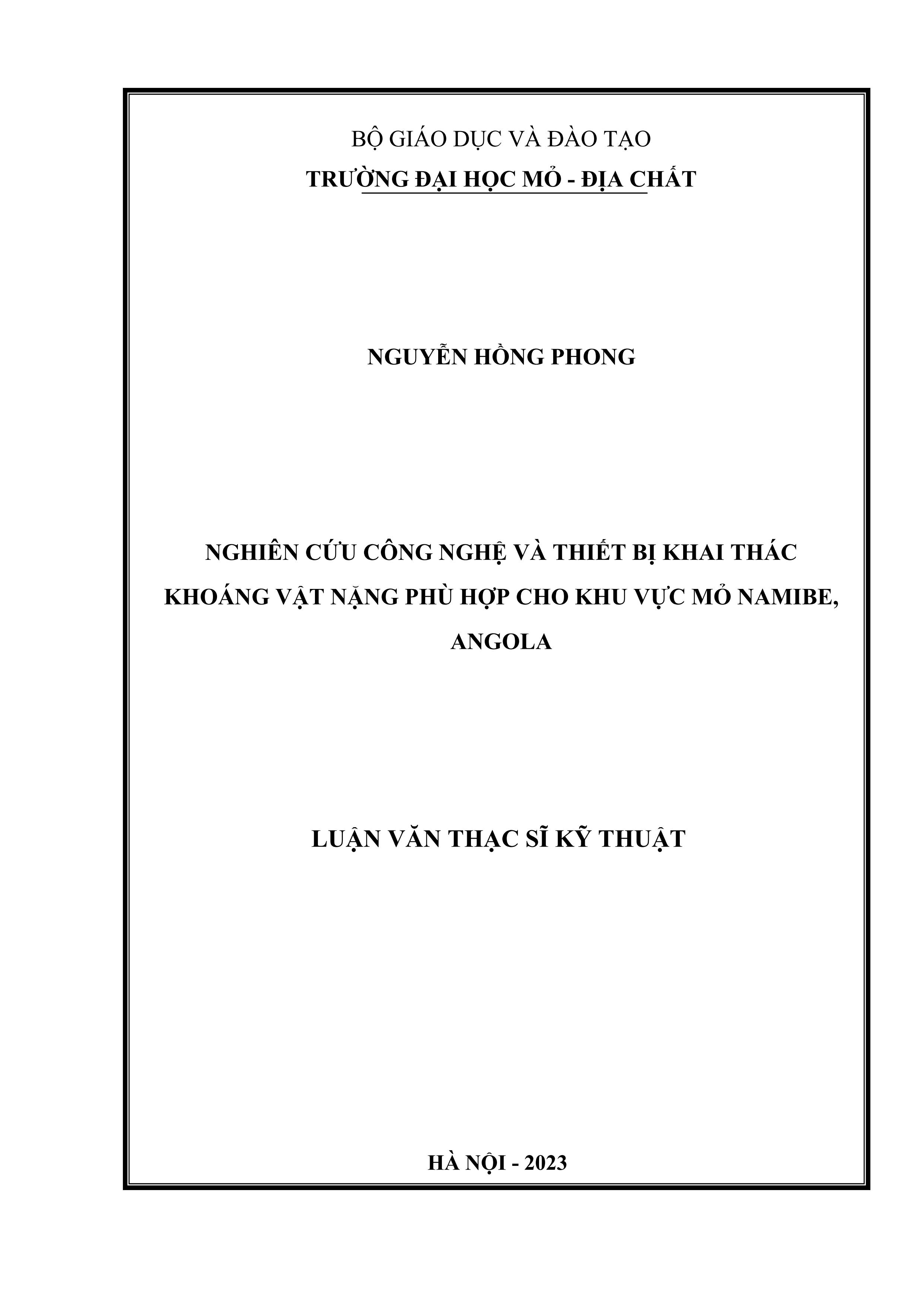 Nghiên cứu công nghệ và thiết bị khai thác khoáng vật nặng phù hợp cho khu vực mỏ Namibe Angola : Luận văn thạc sĩ kỹ thuật / Nguyễn Hồng Phong