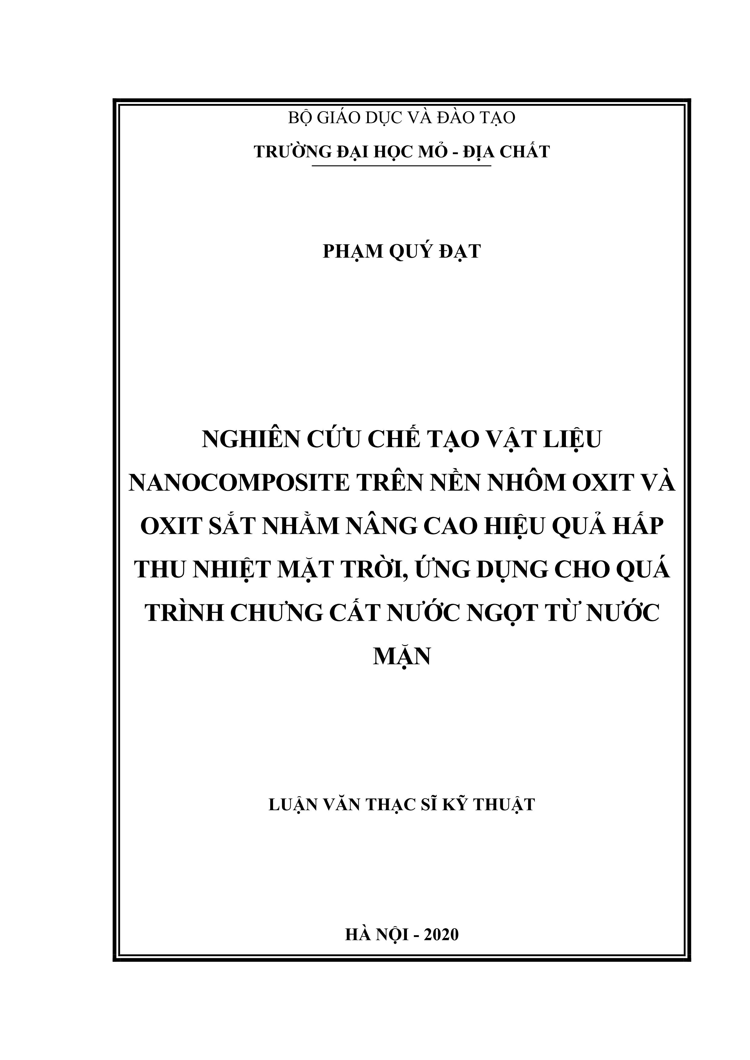Nghiên cứu chế tạo vật liệu Nanocomposite trên nền nhôm oxit và oxit sắt nhằm nâng cao hiệu quả hấp thu nhiệt mặt trời, ứng dụng cho quá trinh chưng cất nước ngọt từ nước mặn : Luận văn thạc sĩ kỹ thuật / Phạm Quý Đạt