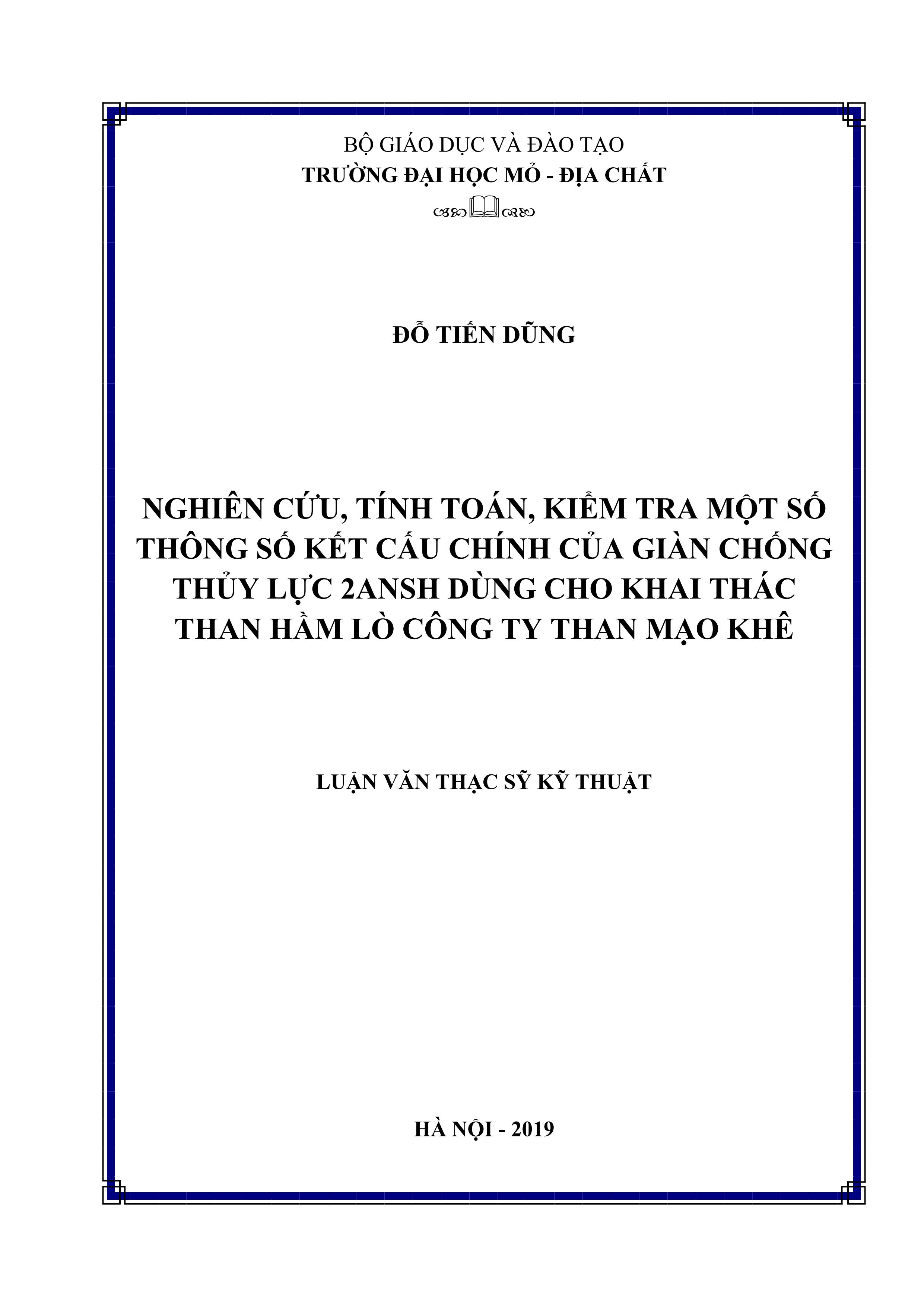 Nghiên cứu, tính toán, kiểm tra một số thông số kết cấu chính của giàn chống thủy lực 2ANSH dùng cho khai thác than hầm lò Công ty than Mạo Khê : Luận văn thạc sĩ kỹ thuật / Đỗ Tiến Dũng