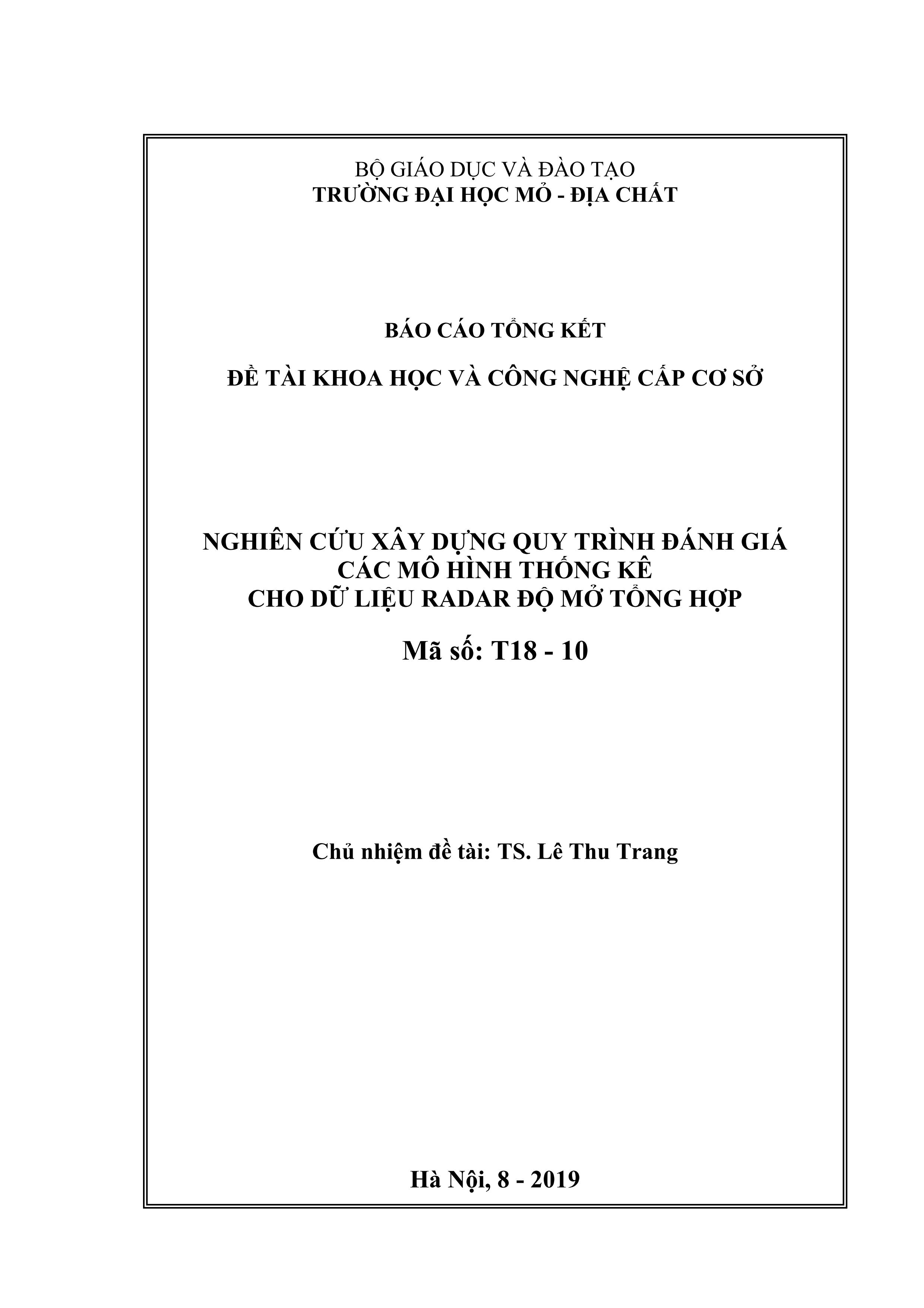 Nghiên cứu xây dựng quy trình đánh giá các mô hình thống kê cho dữ liệu Radar độ mở tổng hợp : Đề tài khoa học và công nghệ cấp cơ sở / Lê Thu Trang