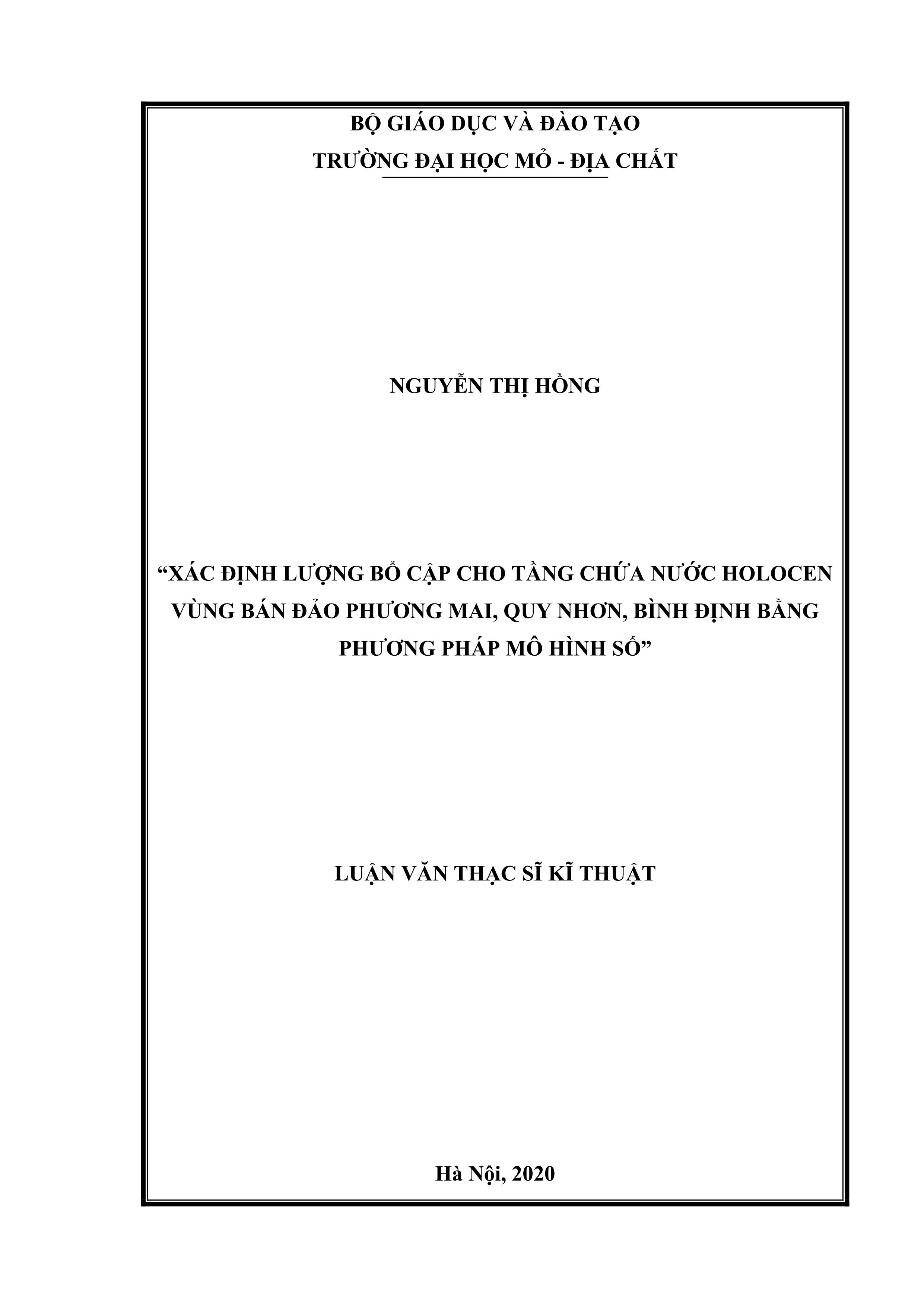 Xác định lượng bổ cập cho tầng chứa nƣớc Holocen vùng bán đảo Phương Mai, Quy Nhơn, Bình Định bằng phương pháp mô hình số : Luận văn thạc sĩ kỹ thuật / Nguyễn Thị Hồng