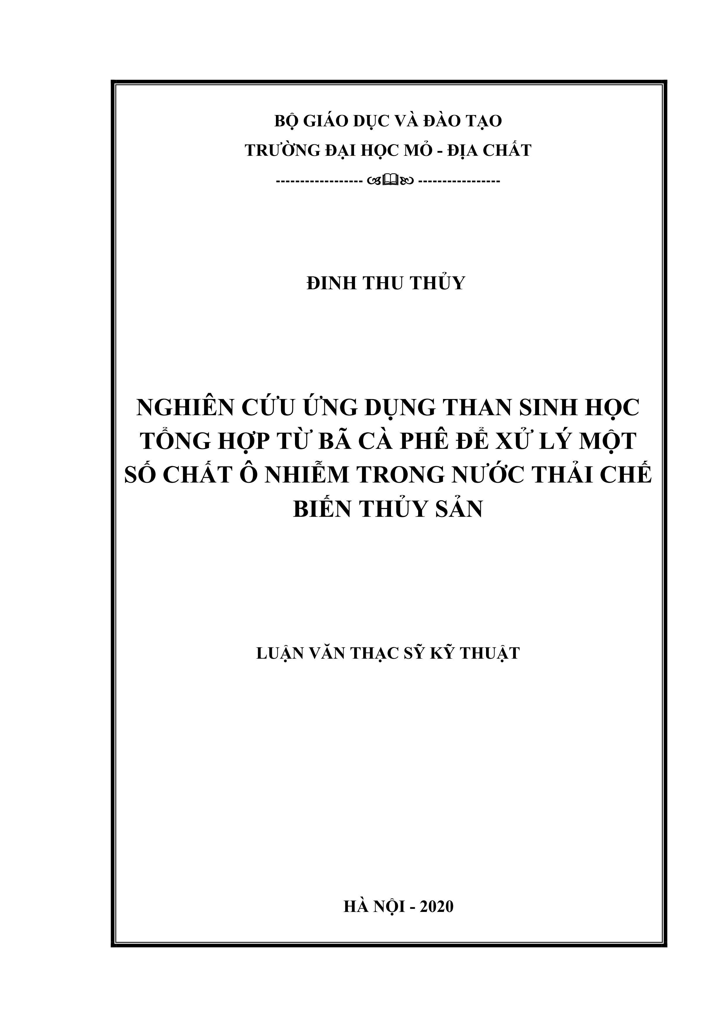 Nghiên cứu ứng dụng than sinh học tổng hợp từ bã hạt cà phê để xử lý một số chất ô nhiễm trong nước thải chế biến thủy sản : Luận văn thạc sĩ kỹ thuật / Đinh Thu Thủy