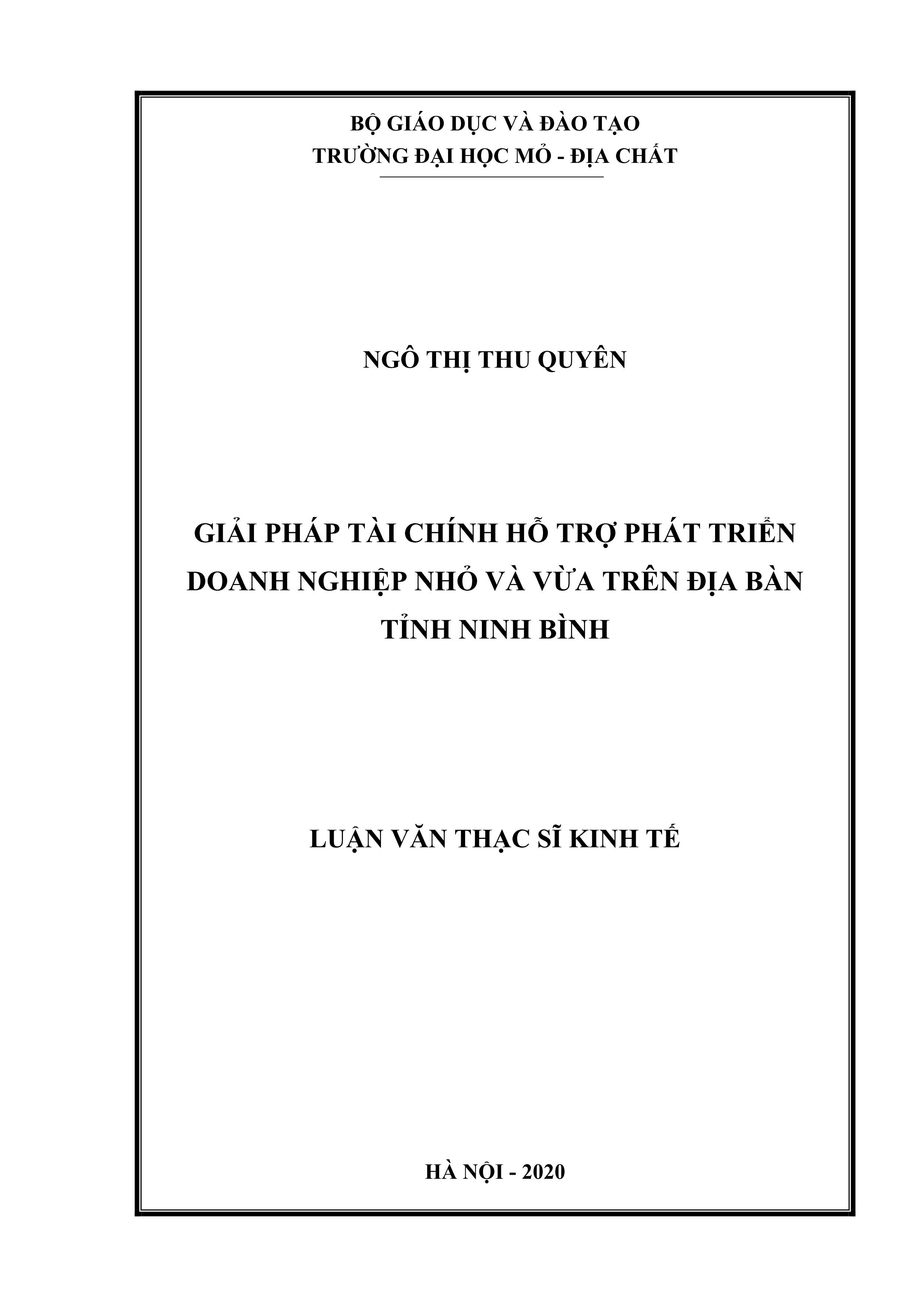 Giải pháp tài chính hỗ trợ phát triển Doanh nghiệp nhỏ và vừa trên địa bàn tỉnh Ninh Bình : Luận văn thạc sĩ Kinh tế / Ngô Thị Thu Quyên