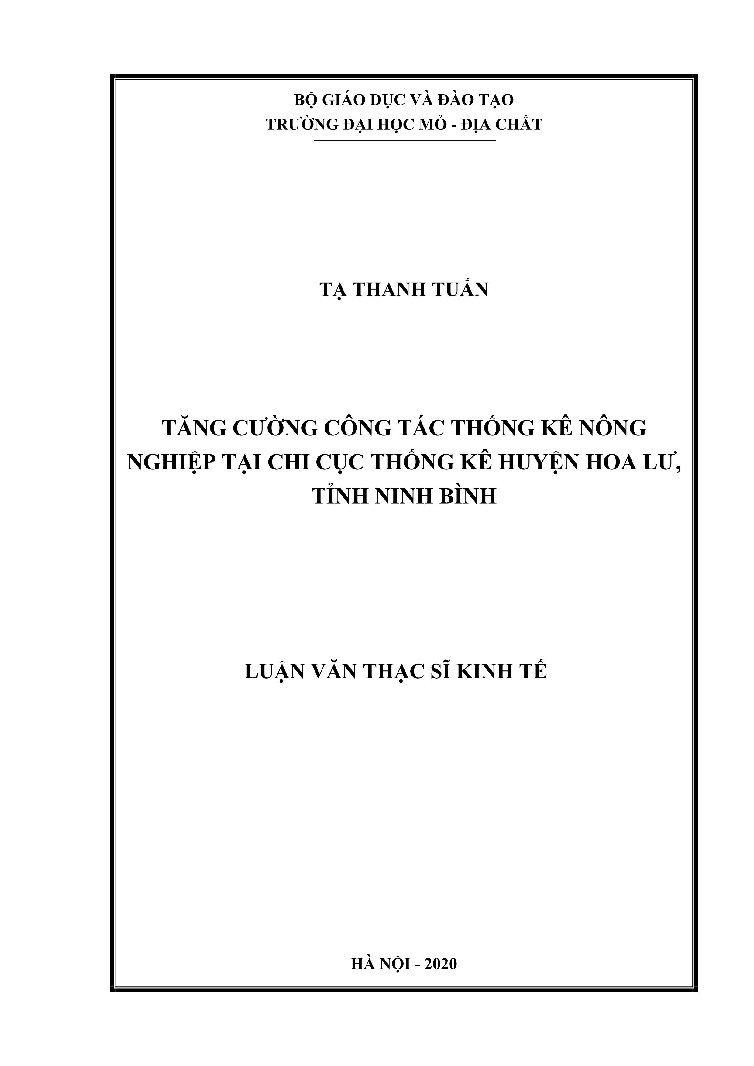 Tăng cường công tác Thống kê nông nghiệp tại Chi cục Thống kê huyện hoa Lư, tỉnh Ninh Bình : Luận văn thạc sĩ Kinh tế / Tạ Thanh Tuấn