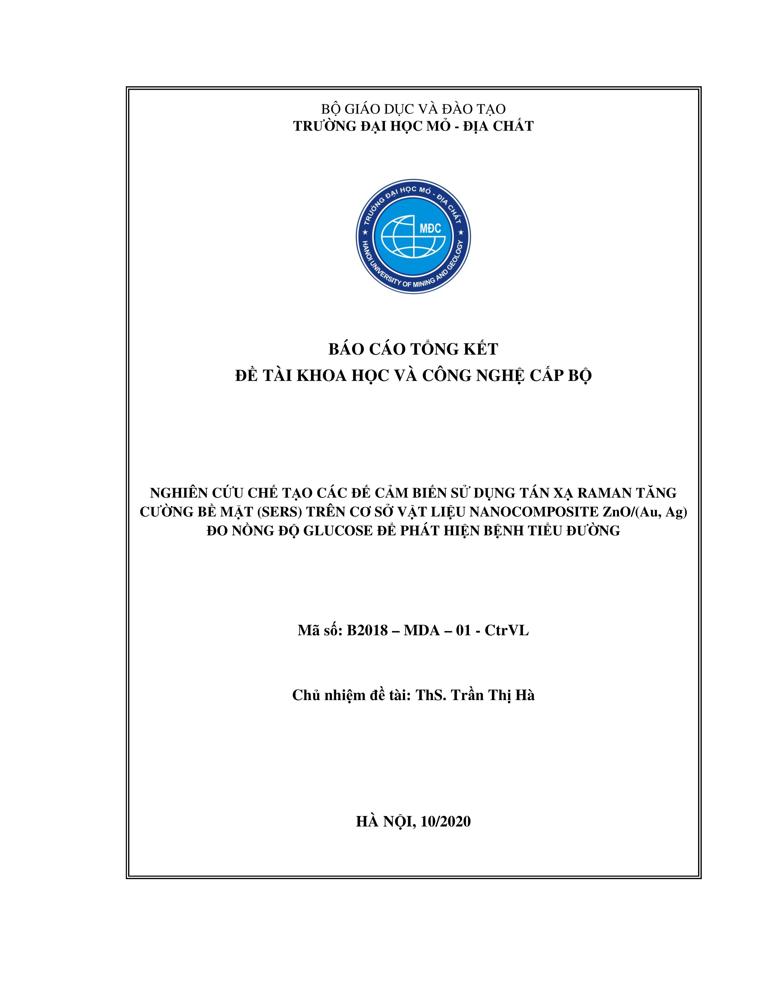 Nghiên cứu chế tạo các đế cảm biến sử dụng tán xạ Raman tăng cường bề mặt (Sers) trên cơ sở vật liệu Nanocomposite ZnO/ Đề tài khoa học và công nghệ cấp bộ / (Au, Ag) đo nồng độ Glucose để phát hiện bệnh tiểu đường :