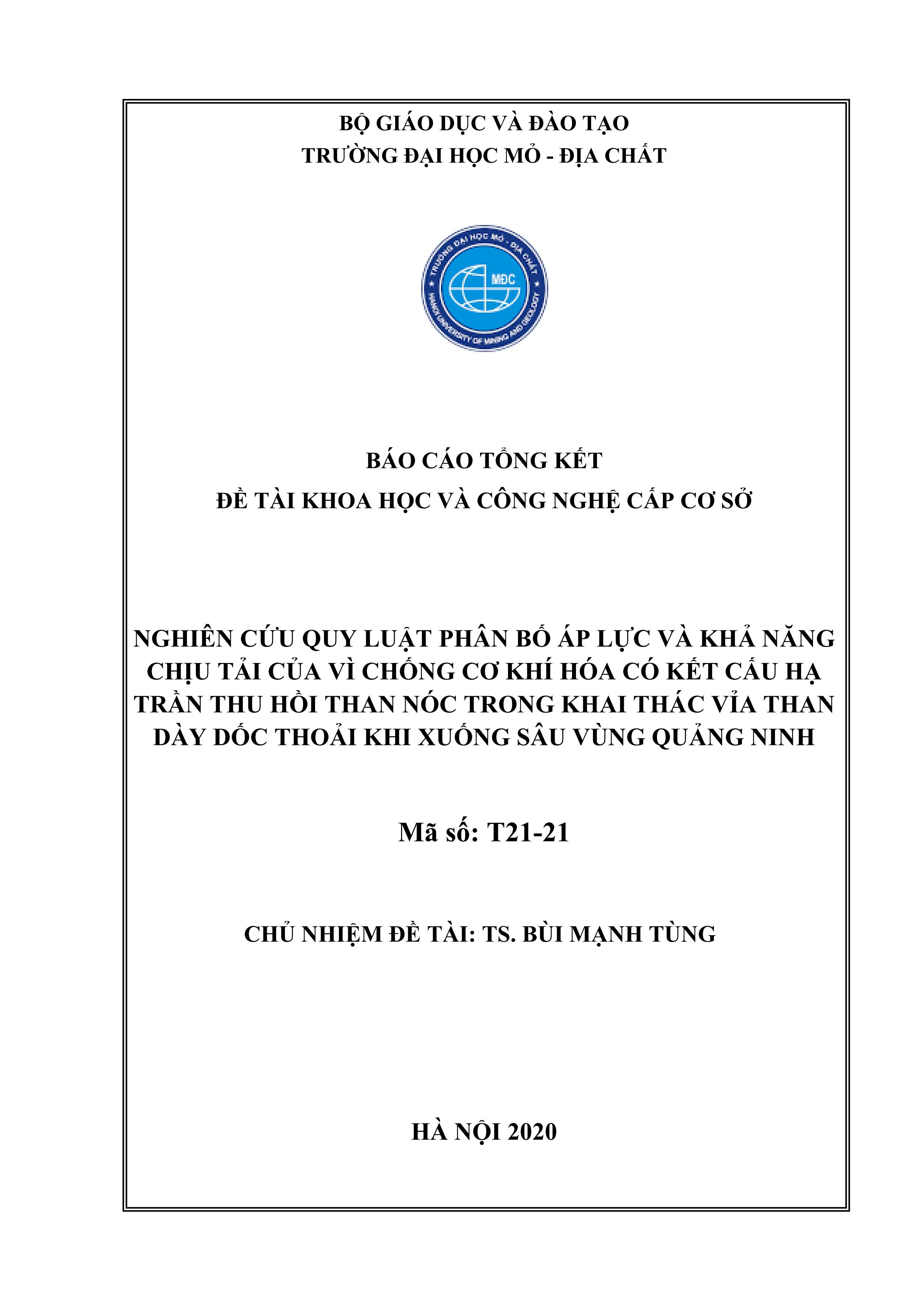 Nghiên cứu quy luật phân bố áp lực và khả năng chịu tải của vì chống cơ khí hóa có kết cấu hạ trần thu hồi than nóc trong khai thác vỉa than dày dốc thoải khi xuống sâu vùng Quảng Ninh : Đề tài khoa học và công nghệ cấp cơ sở / Bùi Mạnh Tùng