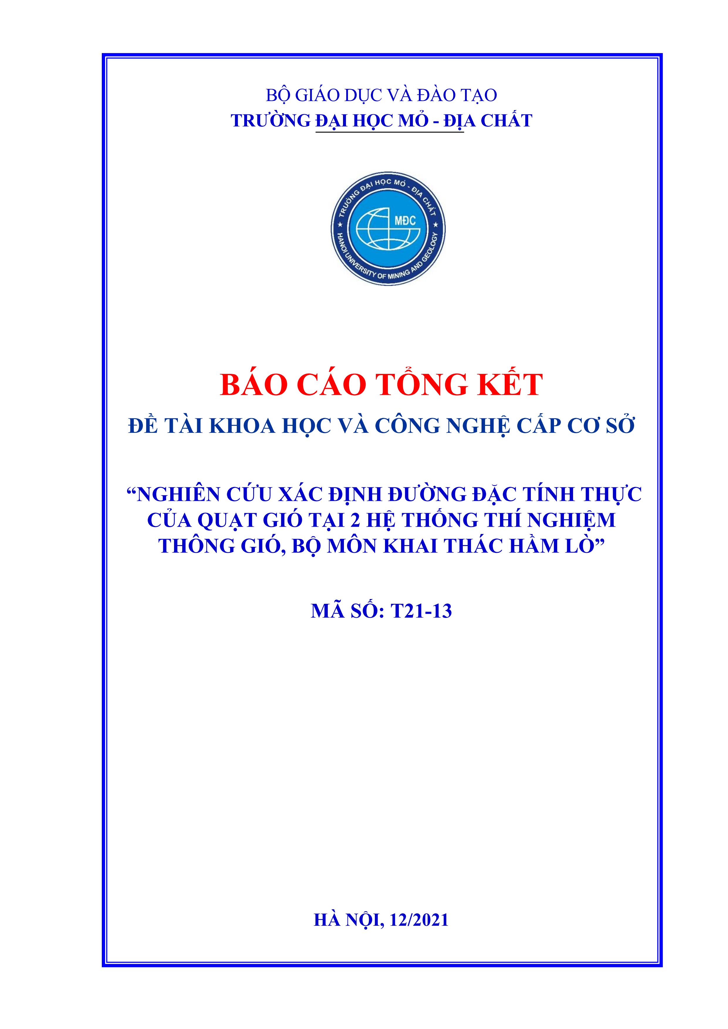 Nghiên cứu xác định đường đặc tính thực của quạt gió tại 2 hệ thống thí nghiệm thông gió, bộ môn khai thác hầm lò : Đề tài khoa học và công nghệ cấp cơ sở / Nguyễn Cao Khải