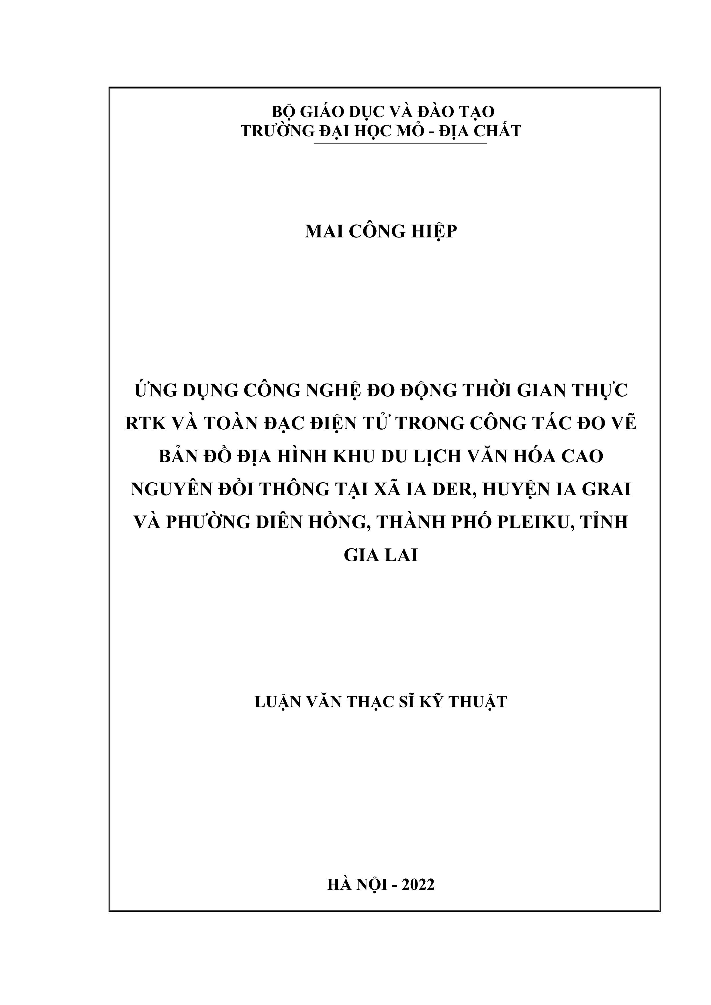 Ứng dụng công nghệ đo động thời gian thực RTK và toàn đạc điện tử trong công tác đo vẽ bản đồ địa hình khu du lịch văn hóa cao nguyên đồi thông tại xã IA DER, huyện IA GRAI và phường Diên Hồng, thành phố Pleiku, tỉnh Gia lai : Luận văn thạc sĩ kỹ thuật / Thạc sĩ