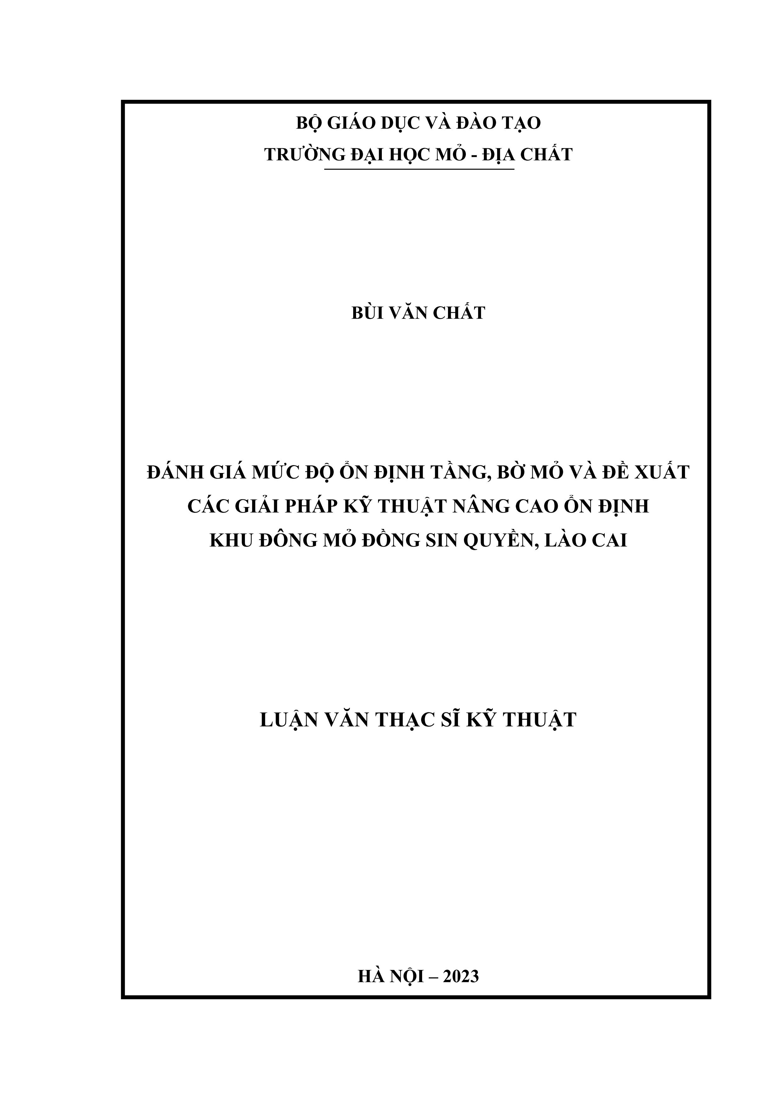Đánh giá mức độ ổn định tầng, bờ mỏ và đề xuất các giải pháp kỹ thuật nâng cao ổn định khu Đông mỏ Đồng Sin Quyền, Lào Cai : Luận văn thạc sĩ kỹ thuật / Bùi Văn Chất