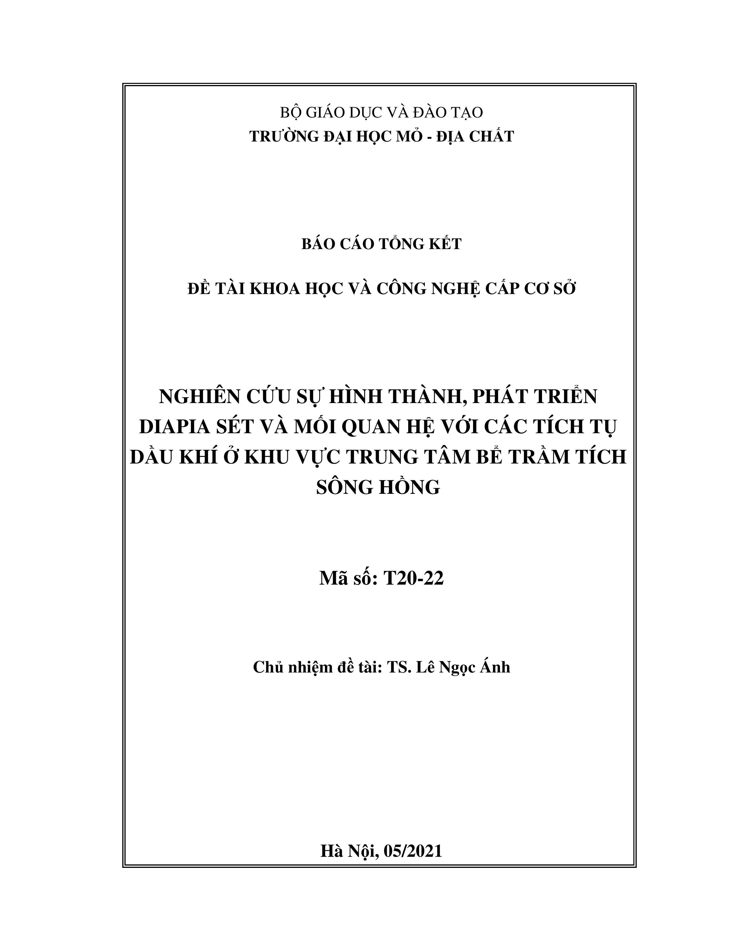 Nghiên cứu sự hình thành, phát triển Diapia sét và mối quan hệ với các tích tụ dầu khí ở khu vực trung tâm bể trầm tích Sông Hồng : Đề tài khoa học và công nghệ cấp cơ sở / Lê Ngọc Ánh