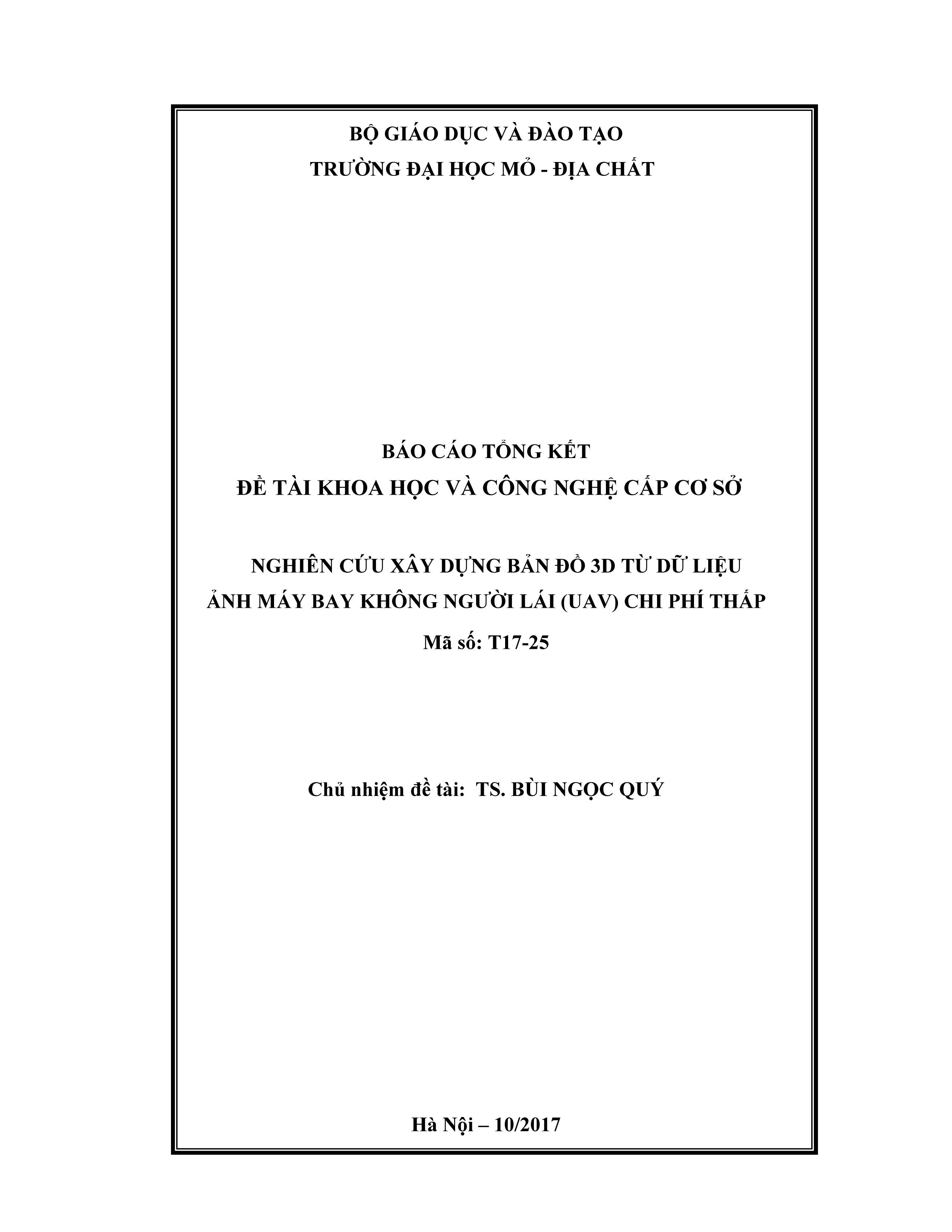 Nghiên cứu xây dựng bản đồ 3D từ dữ liệu ảnh máy bay không người lái (UAV) chi phí thấp : Đề tài khoa học và công nghệ cấp cơ sở / Bùi Ngọc Quý