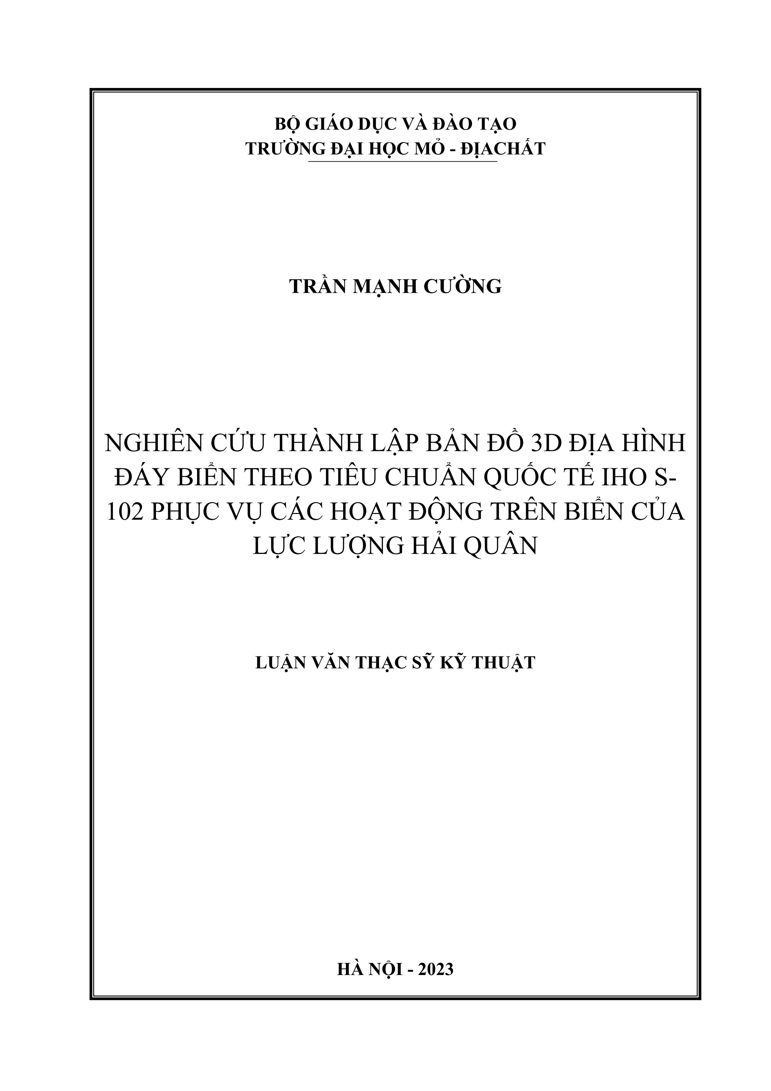 Nghiên cứu thành lập bản đồ 3D địa hình đáy biển theo tiêu chuẩn quốc tế IHO S-102 phục vụ các hoạt động trên biển của lực lượng hải quân : Luận văn thạc sĩ kỹ thuật / Trần Mạnh Cường