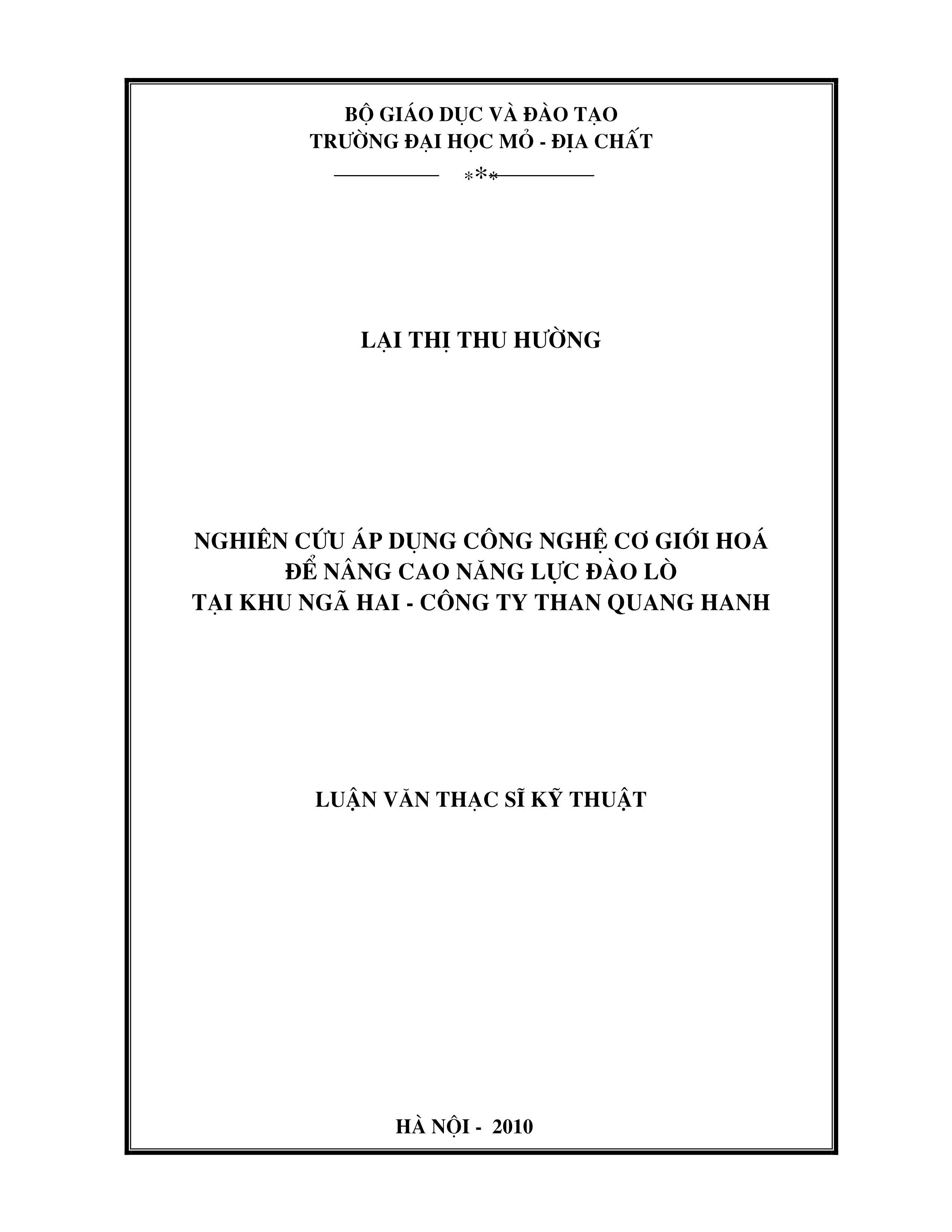 Nghiên cứu áp dụng công nghệ cơ giới hoá để nâng cao năng lực đào lò tại khu Ngã Hai - Công ty than Quang Hanh : Luận văn thạc sĩ / Lại Thị Thu Hường