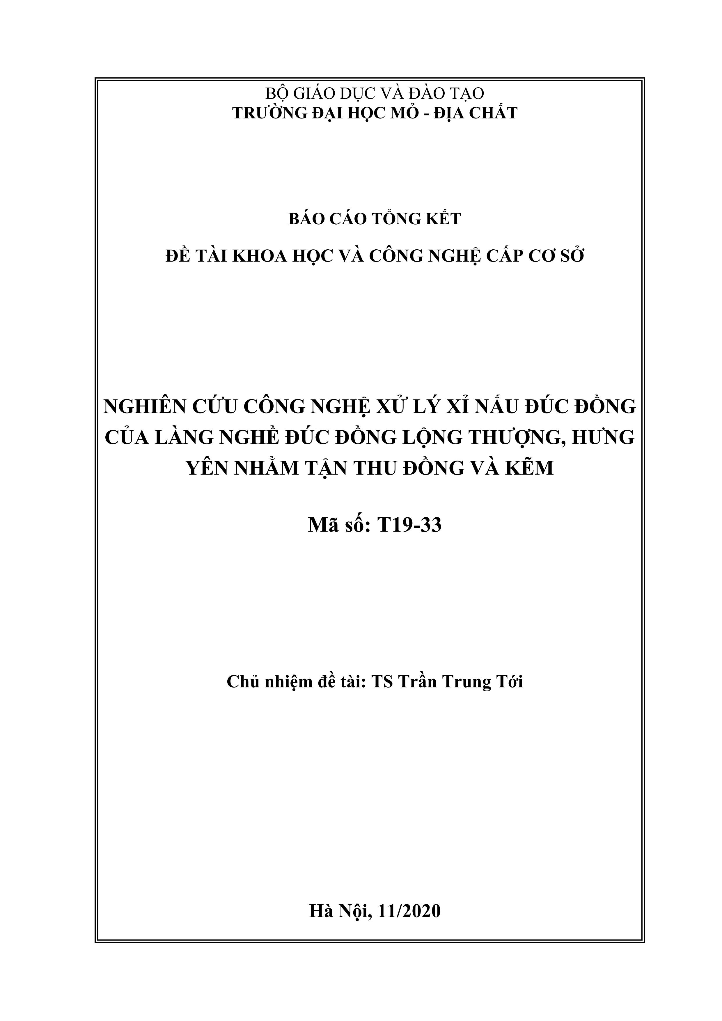 | Nghiên cứu công nghệ xử lý xỉ nấu đúc đồng của làng nghề đúc đồng Lộng Thượng, Hưng Yên nhằm tận thu Đồng và Kẽm :Đề tài khoa học và công nghệ cấp cơ sở / Trần Trung Tới |