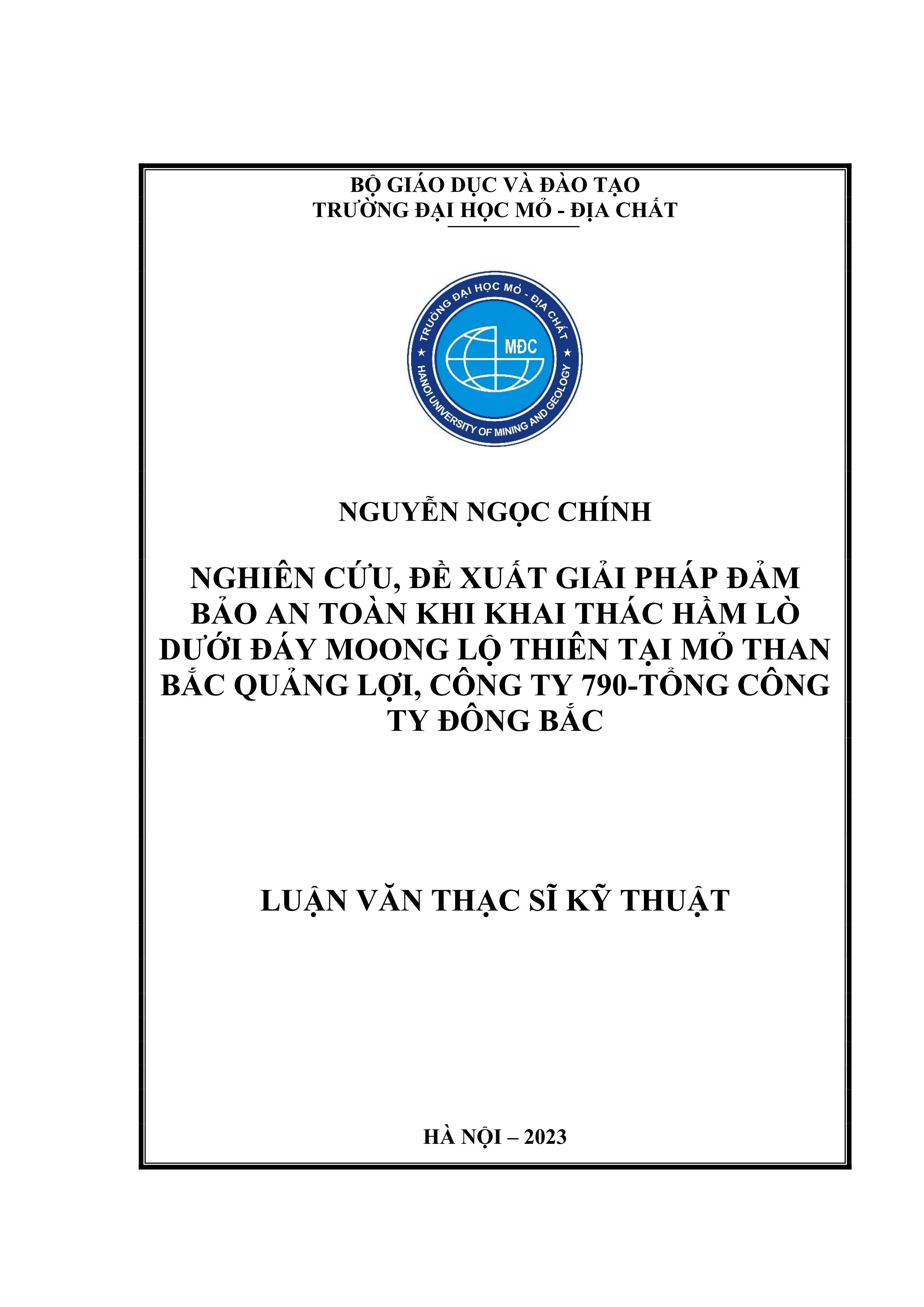 Nghiên cứu, đề xuất giải pháp đảm bảo an toàn khi khai thác hầm lò dưới đáy moong lộ thiên tại mỏ than Bắc Quảng Lợi, công ty 790 - Tổng công ty Đông Bắc : Luận văn thạc sĩ kỹ thuật / Nguyễn Ngọc Chính