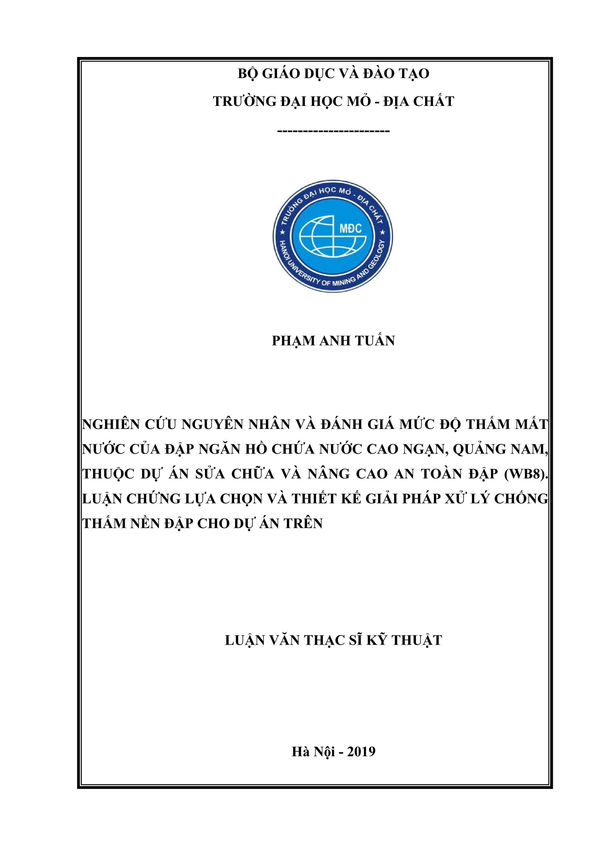 Nghiên cứu nguyên nhân và đánh giá mức độ thấm mất nước của đập ngăn hồ chứa nước Cao Ngạn, Quảng Nam, thuộc Dự án sửa chữa và nâng cao an toàn đập (WB8). Luận chứng lựa chọn và thiết kế giải pháp xử lý chống thấm nền đập cho Dự án trên : Luận văn thạc sĩ kỹ thuật / Phạm Anh Tuấn