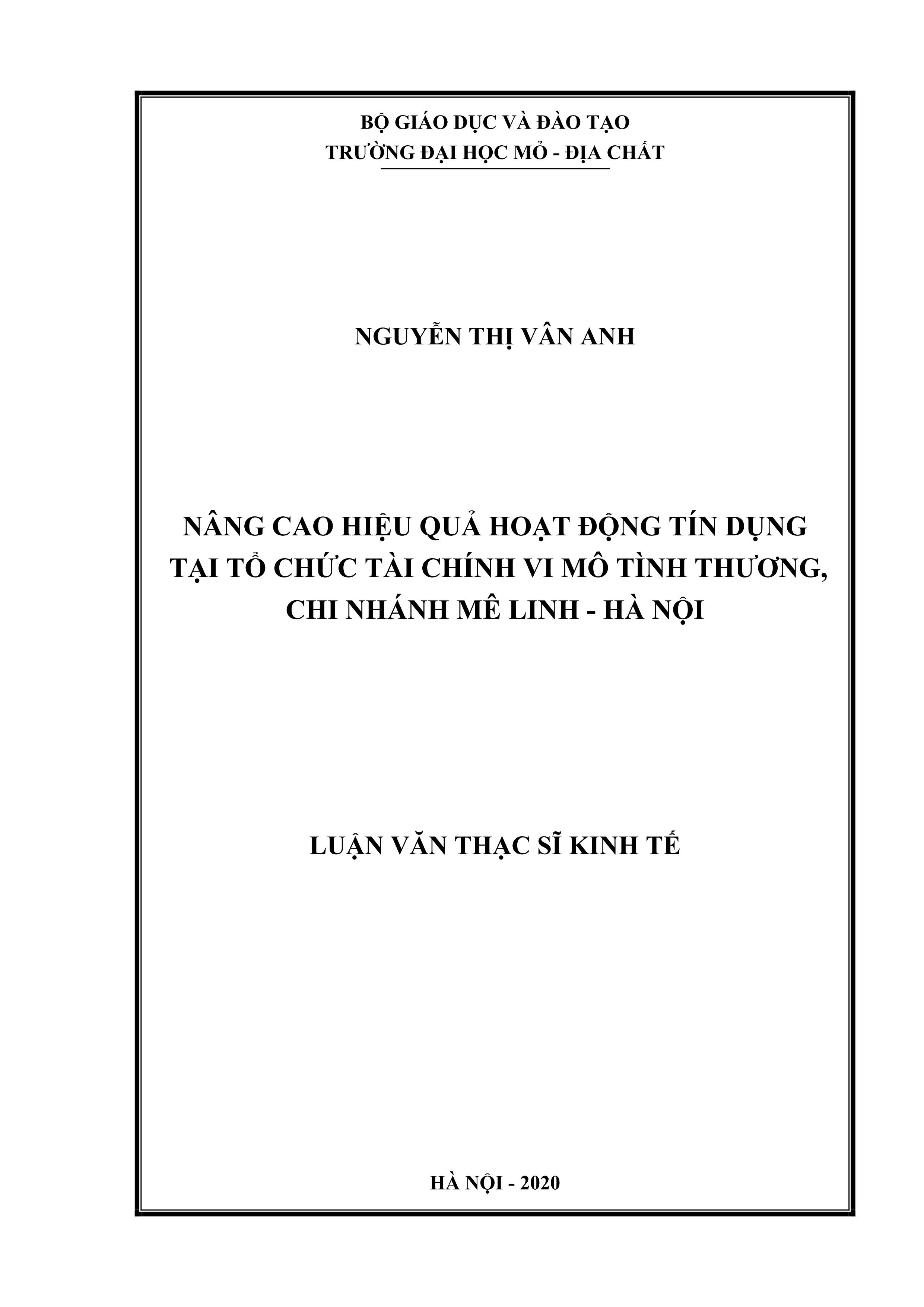 Nâng cao hiệu quả hoạt động tín dụng tại Tổ chức Tài chính Vi mô Tình Thương - Chi nhánh Mê Linh, Hà Nội : Luận văn thạc sĩ Kinh tế / Nguyễn Thị Vân Anh