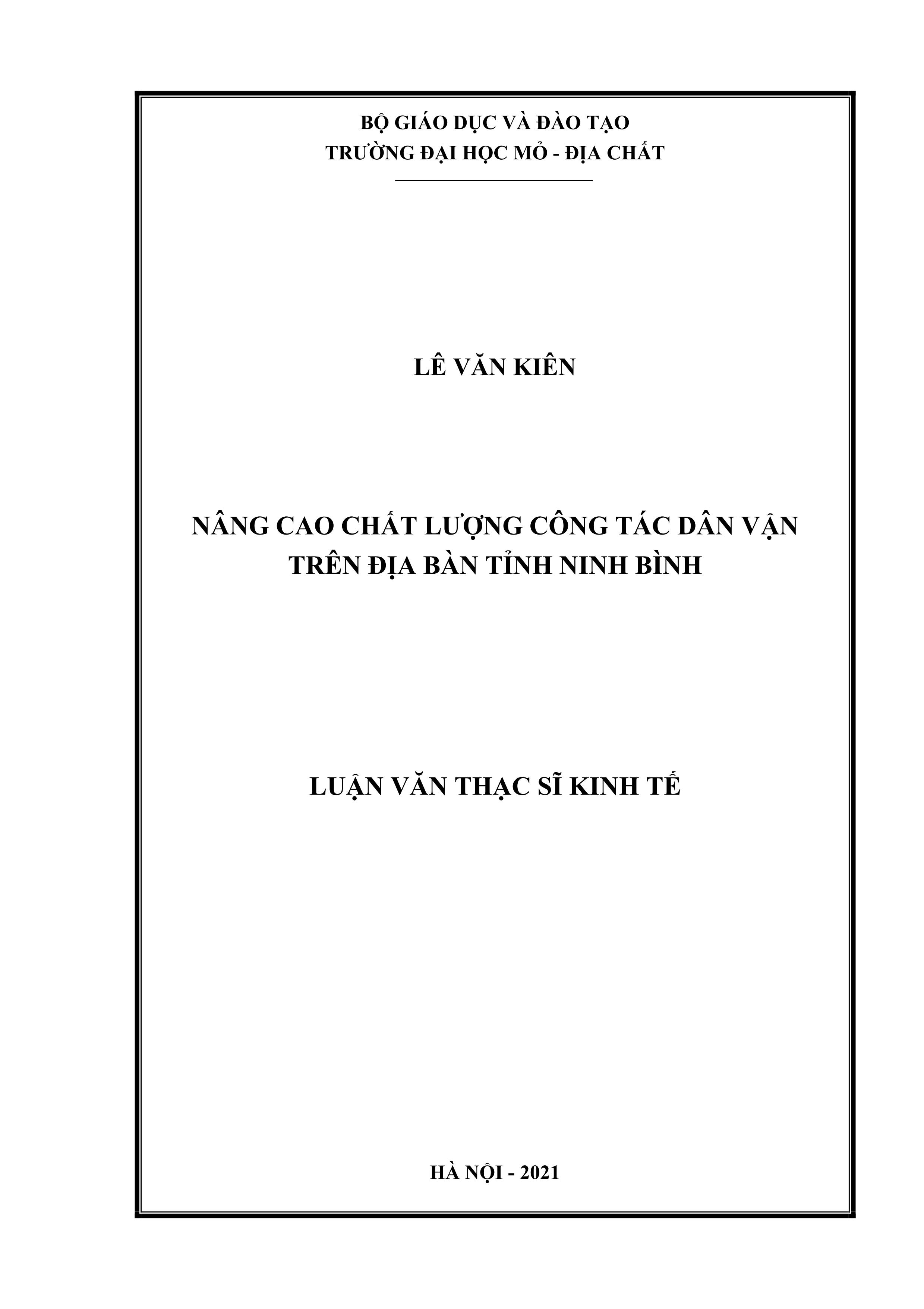 Nâng cao chất lượng công tác dân vận trên địa bàn tỉnh Ninh Bình : Luận văn thạc sĩ Kinh tế / Lê Văn Kiên
